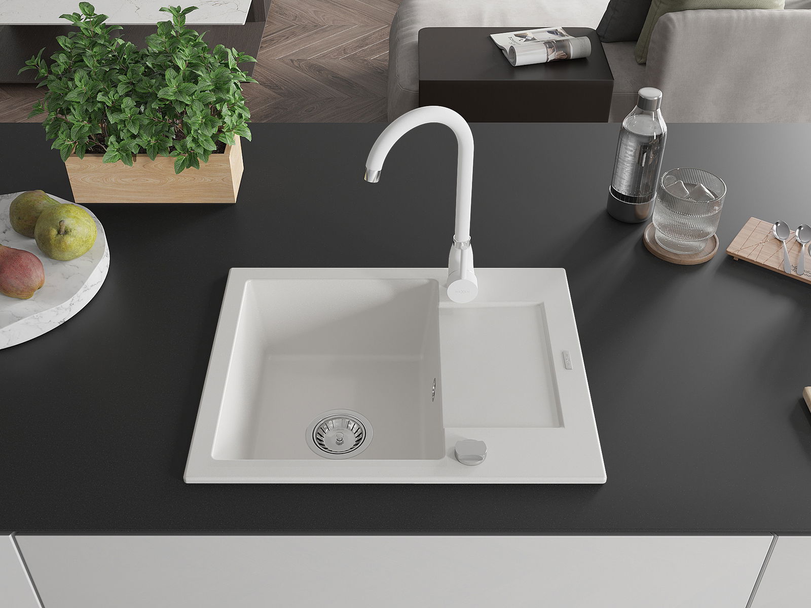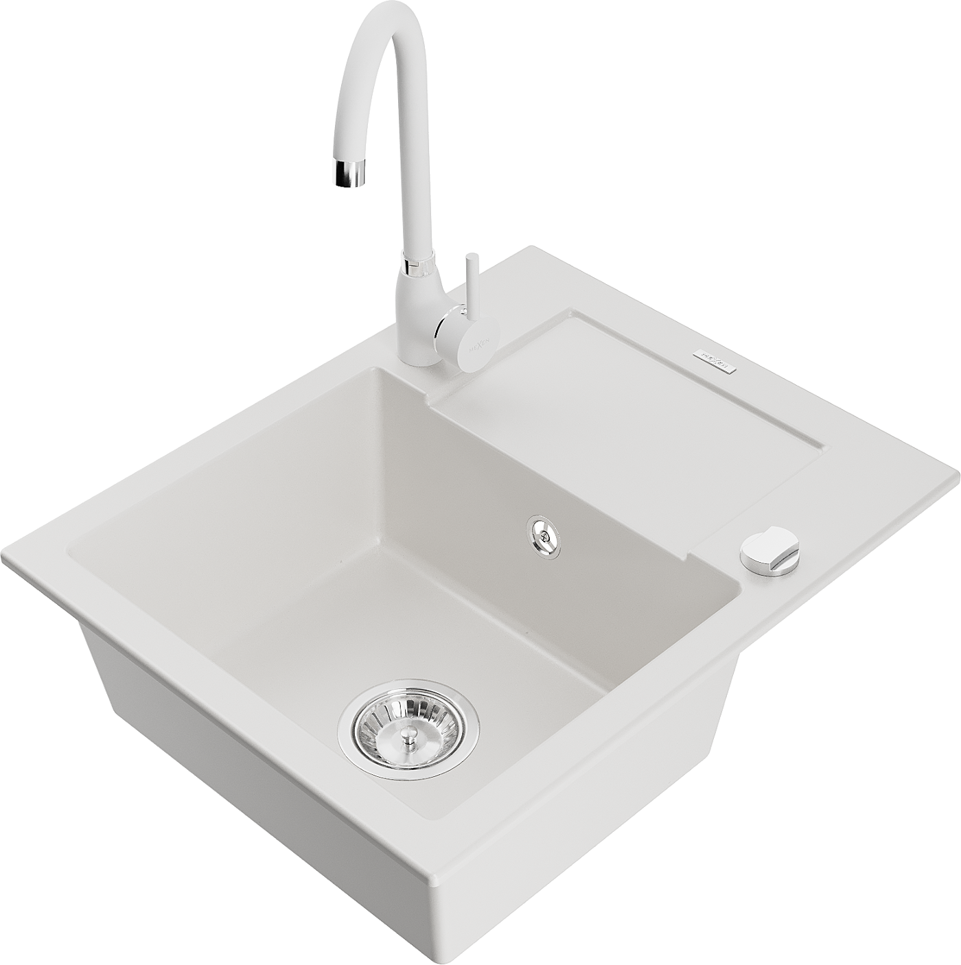 Mexen Enzo granitinė vienos sekcijos kriauklė su drenažu ir virtuviniu maišytuvu Telma, balta - 6506-20-670200-20