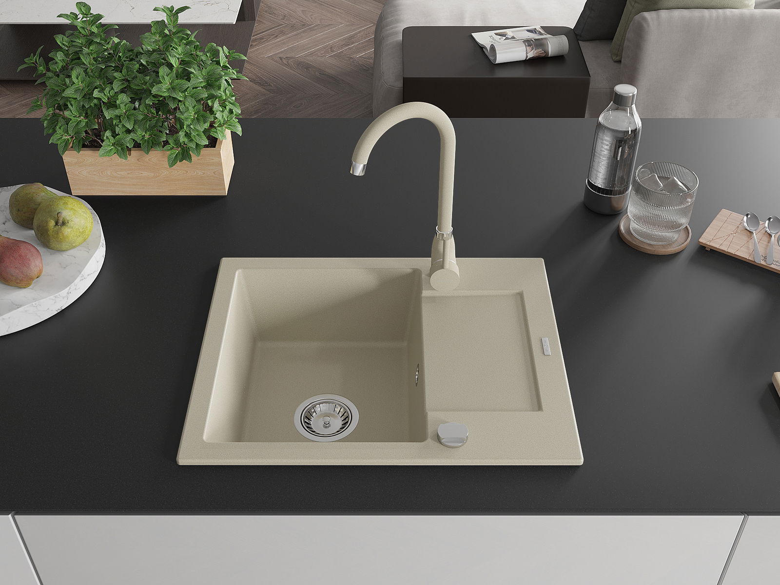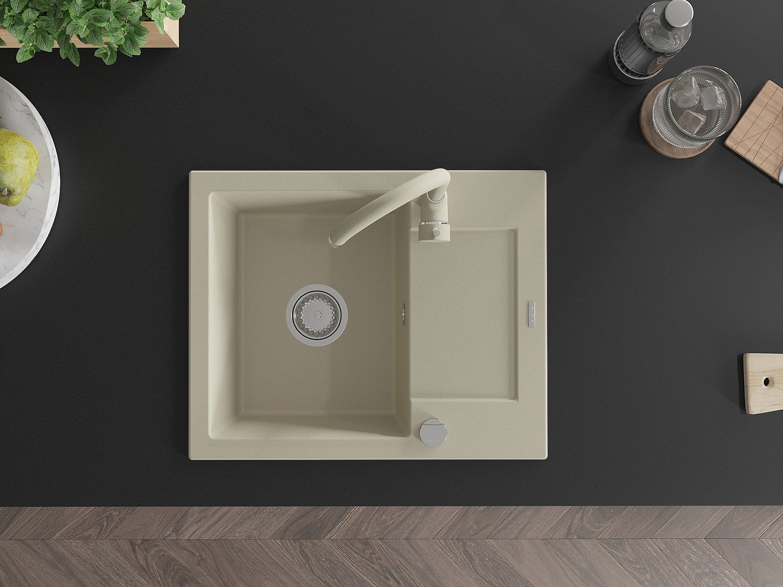 Mexen Enzo granitinis kriauklė su 1 skyriumi ir nusausintuvu bei virtuvės maišytuvu Telma, smėlio - 6506-69-670200-69