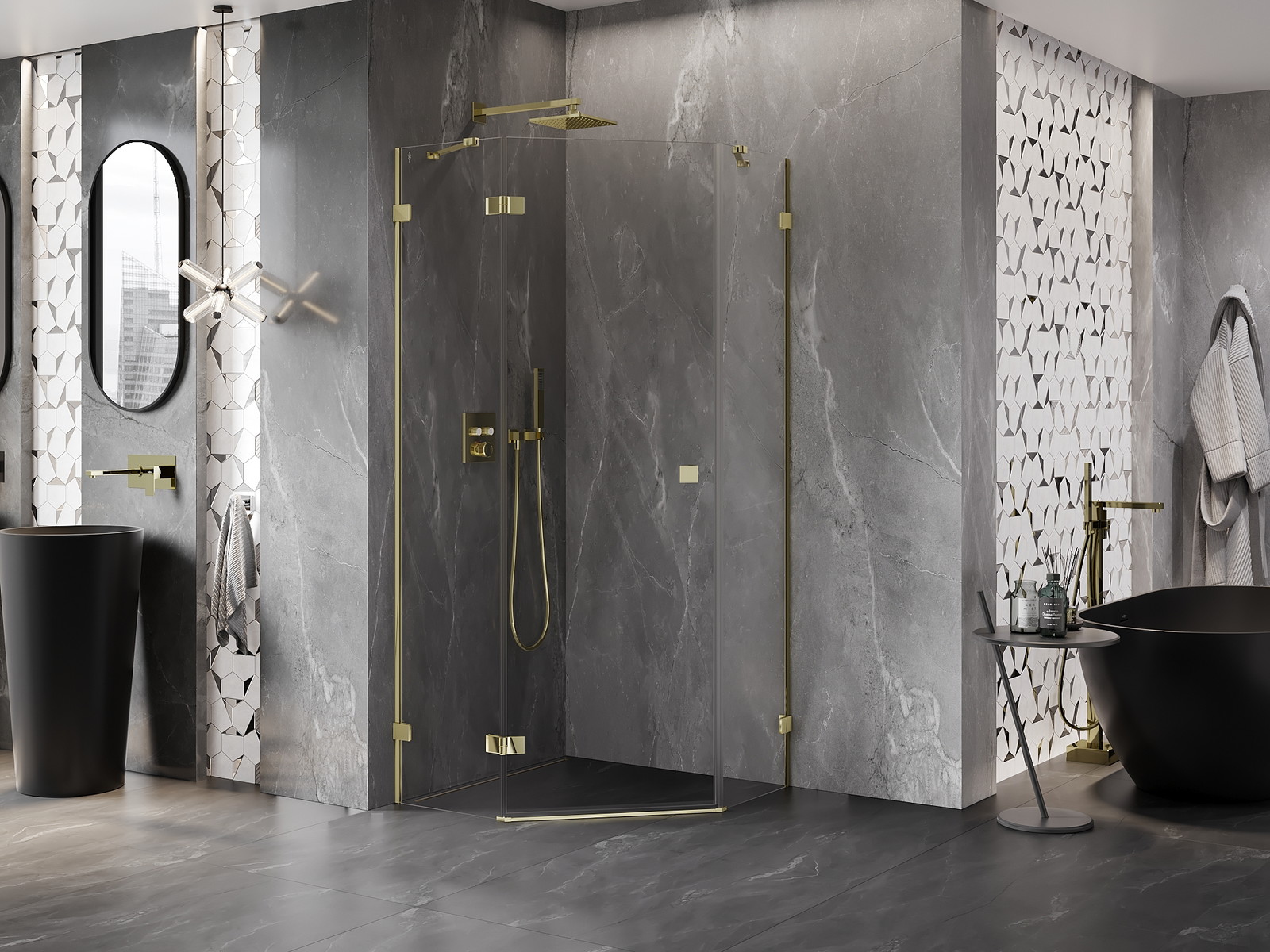 Mexen Lunar yra elegantiška penkiakampė dušo kabina, žavinti auksine apdaila ir skaidriu 8 mm storio grūdintu stiklu. Idealiai tinka stilingoms vonios kambariams, kurių aukštis yra 200 cm ir dydis 90x90 cm su kairėmis atverčiamomis durimis. Dėl durų pakėlimo ir nuleidimo mechanizmo bei valymą palengvinančios dangos naudojimas yra itin patogus. Be to, dvi tvirtinimo sistemos leidžia puikiai prisitaikyti prie įvairių sienų tipų, o pločio reguliavimas užtikrina montažo universalumą. Aukštos kokybės žalvarinės rankenėlės ir vyriai užtikrina ilgaamžiškumą, o magnetinė juosta ir tarpinės veiksmingai nutekina vandenį. Mexen Lunar sujungia funkcionalumą ir išskirtinį dizainą.
