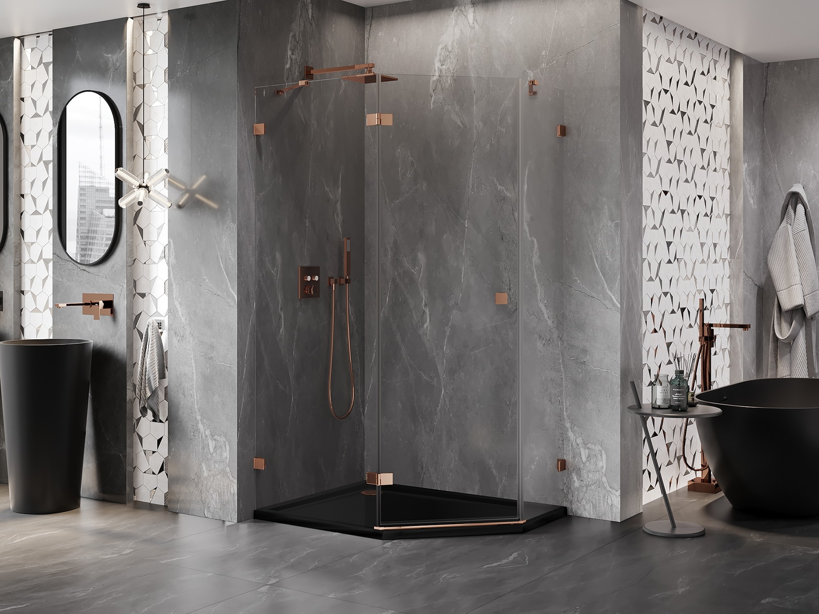 Mexen Lunar yra moderni penkiakampė dušo kabina, kuri žavi elegantiška apdaila rožinio aukso atspalviu. Jos matmenys 100x90 cm ir aukštis 200 cm puikiai prisitaikys prie kiekvieno vonios kambario. Atveriamos durys, sumontuotos kairėje pusėje, suteikia patogų įėjimą, o aliuminis profilis ir galimybė reguliuoti plotį leidžia labai lanksčiai įrengti kabiną. 8 mm storio grūdintas stiklas skaidria spalva garantuoja saugumą ir vizualinę lengvumą. Papildomi privalumai yra specialus sluoksnis, palengvinantis valymą, ir dvi montavimo sistemos, leidžiančios montuoti ant padėklo arba plytelėmis. Durų pakėlimo ir nuleidimo mechanizmas, žalvarinės rankenos ir magnetinės sandarinimo juostos pabrėžia aukštą produkto kokybę ir funkcionalumą.