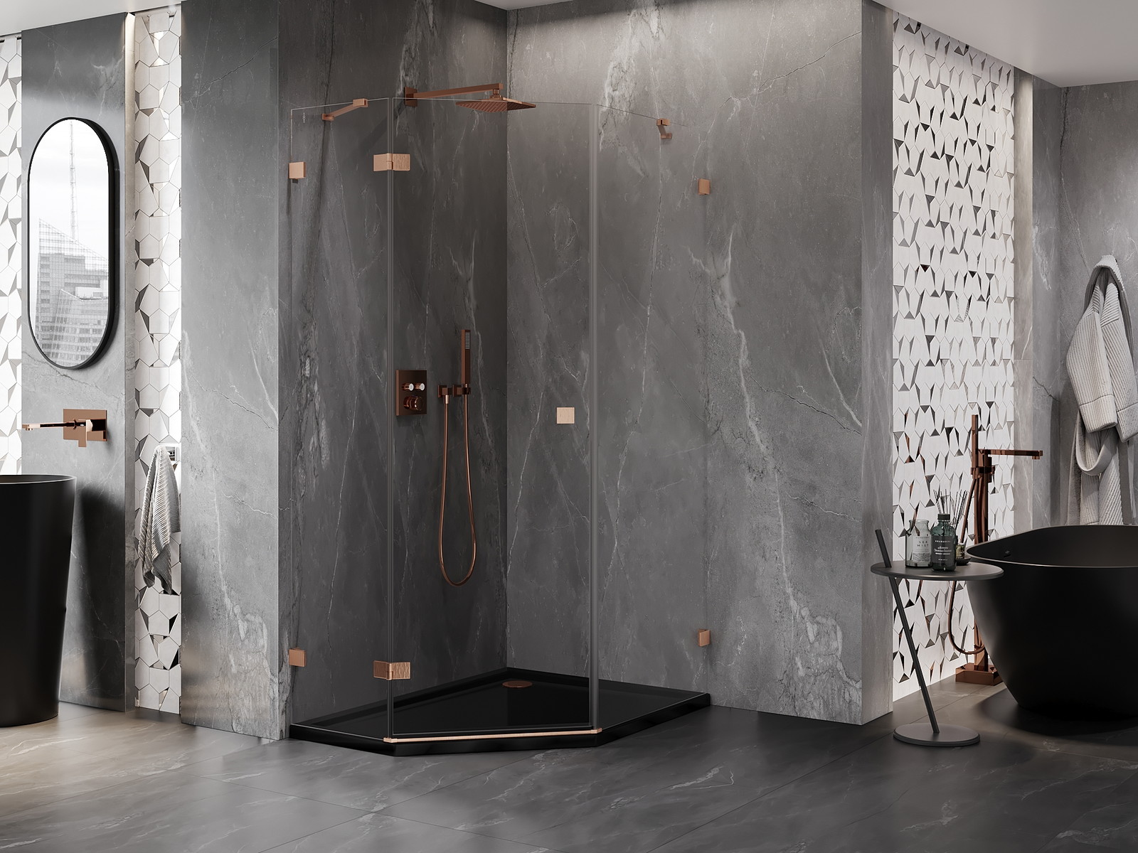 Mexen Lunar yra elegantiška ir šiuolaikinė penkiakampė dušo kabina su atveriamomis durimis, kurios matmenys 90x100 cm, ideali tiems, kurie vertina erdvumą ir funkcionalumą. Šepečiu valytos vario apdaila suteikia jai prabangos. Grūdintas stiklas, kurio storis 8 mm, apsaugo nuo pažeidimų, o pavojų valymas užtikrina, kad jos švarumas nepriekaištingas. Kabina turi aliuminio profilį su reguliavimo galimybe, leidžiančia prisitaikyti prie sienų kreivumo. Magnetinė juostelė ir elastomerinės tarpikliai puikiai drenuoja vandenį, suteikdami komfortą naudojant.