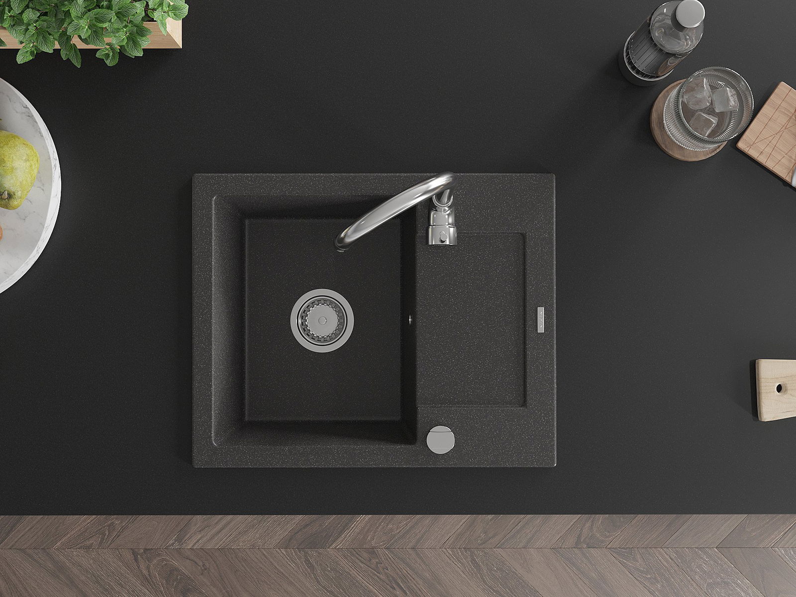Mexen Enzo granitinė 1 skyrelio plautuvė su nuvarvėjimo funkcija ir virtuviniu maišytuvu Telma, juodos spalvos su