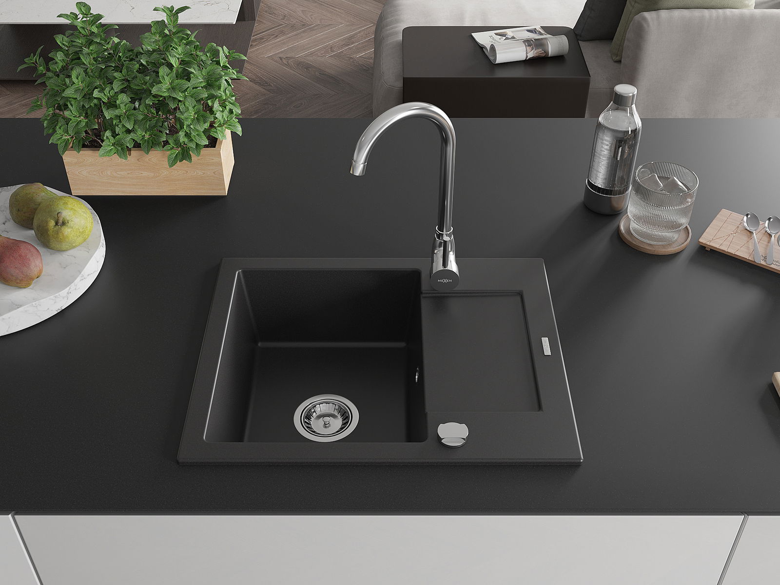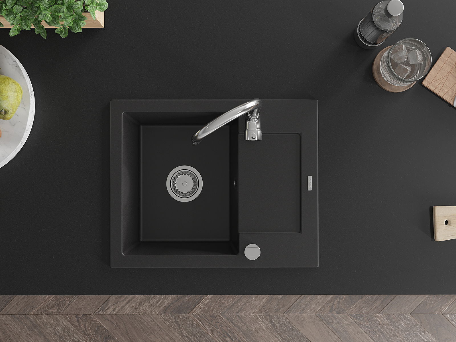 Mexen Enzo 1-komorinis granito kriauklė su nusausinimo skyriumi ir virtuvės maišytuvu Telma, juoda - 6506-77-670200-00