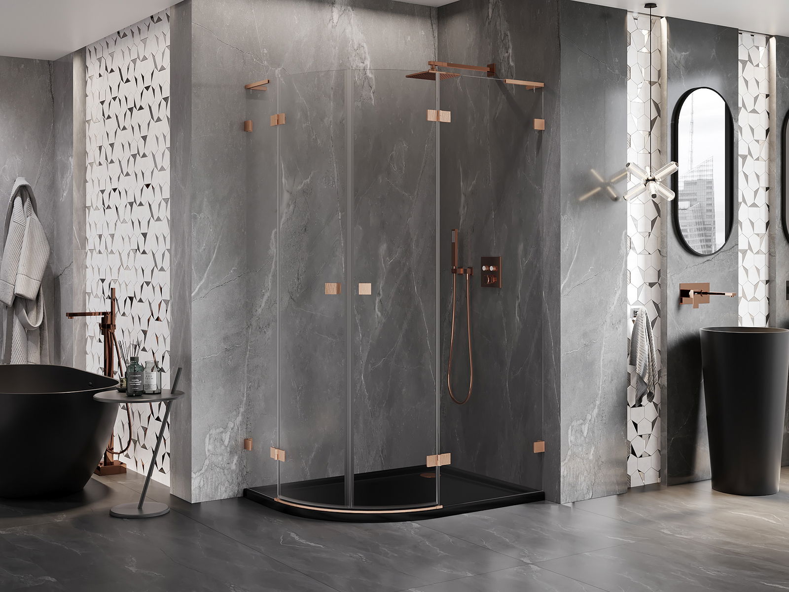 Spaustukai ir vyriai pagaminti iš labai patvaraus žalvario, papildomai sukuriantys lygią stiklo plokštumą. Tai puikus pasirinkimas, jungiantis eleganciją, patvarumą ir šiuolaikinį dizainą. Tokie sprendimai prideda dušo estetikai ir tuo pačiu palengvina švaros palaikymą.