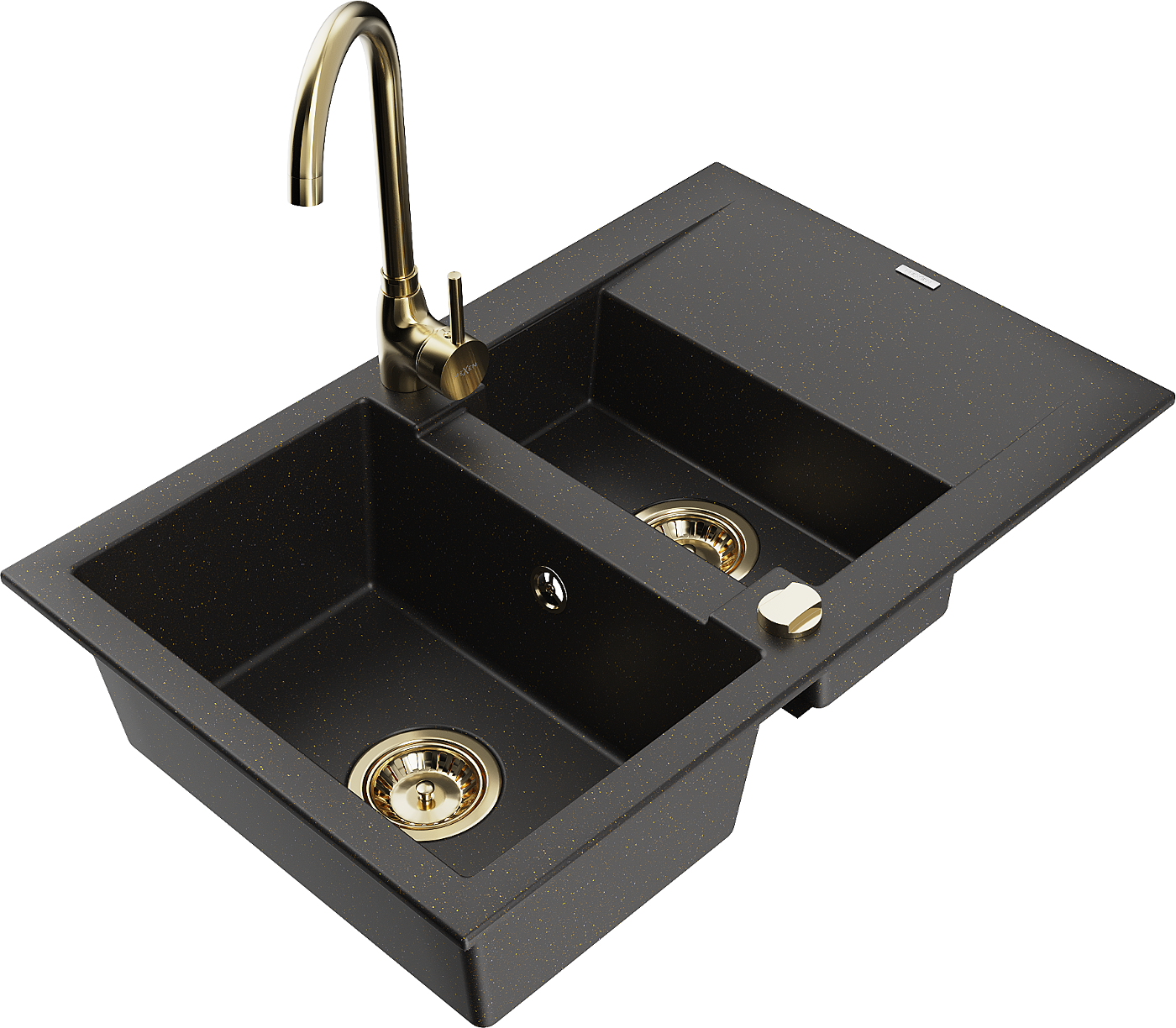 Mexen Gaspar granito kriauklė 1,5 skyrelių su nusausintuvu ir virtuviniu maišytuvu Telma, juoda/auksinė - 6507-75-670200-50