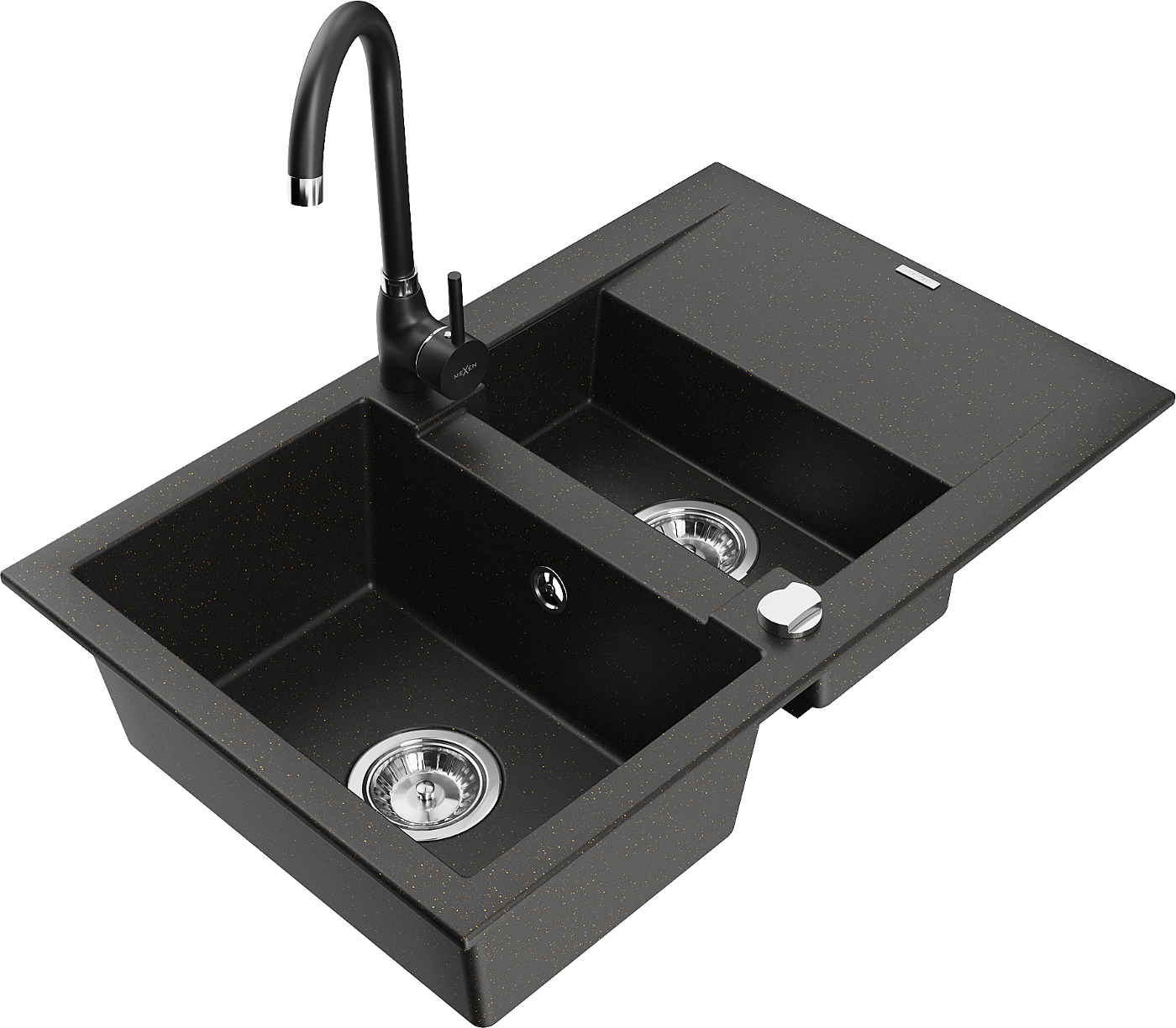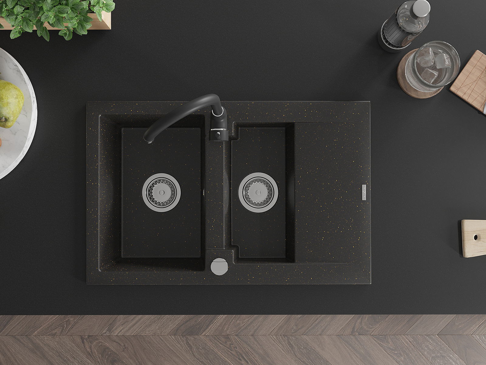 Mexen Gaspar granito plautuvė 1,5 kameros su džiovykla ir virtuviniu maišytuvu Telma, juoda/auksinė - 6507-75-670200-70