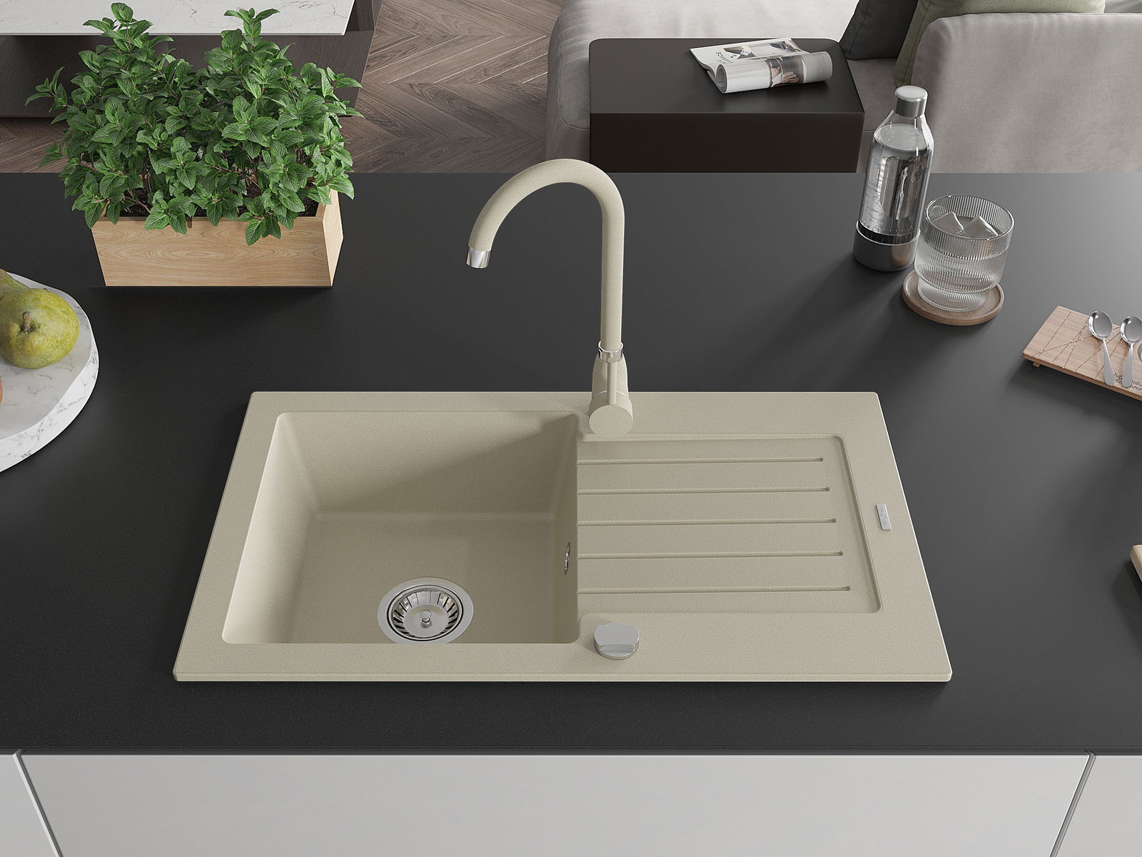 Mexen Pablo granitinis vienos kameros plautuvė su nusausintuvu ir virtuviniu maišytuvu Telma, smėlio - 6510-69-670200-69