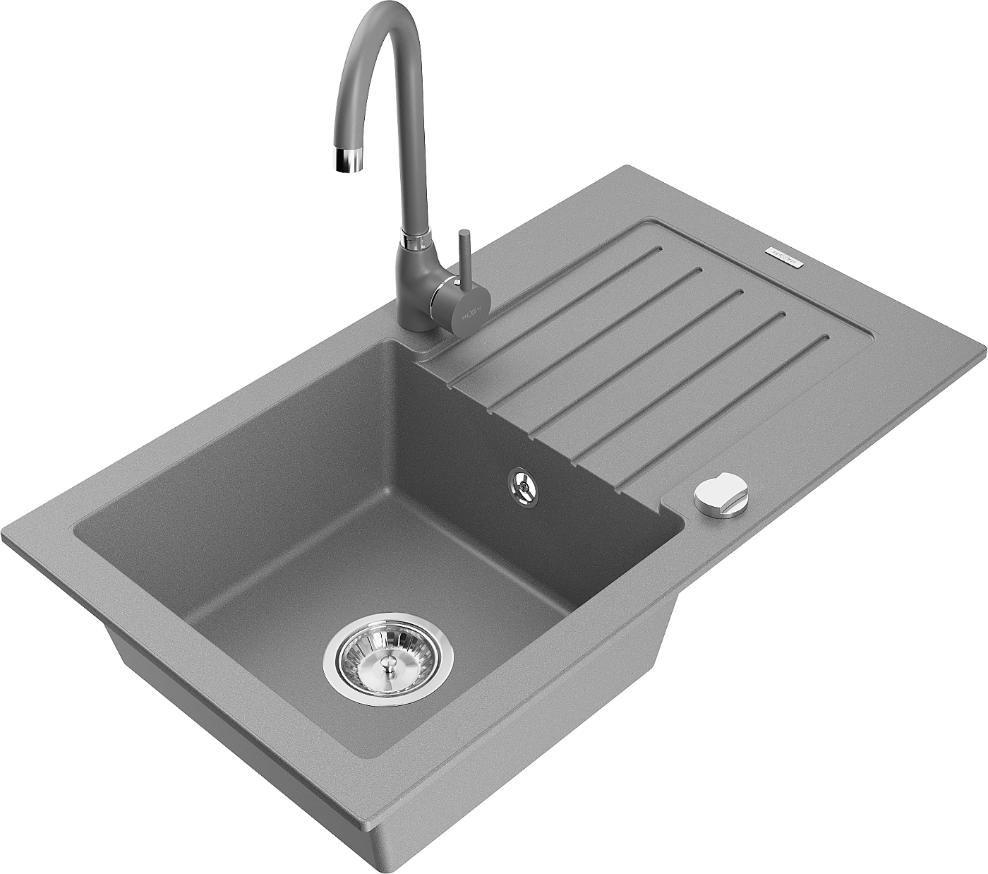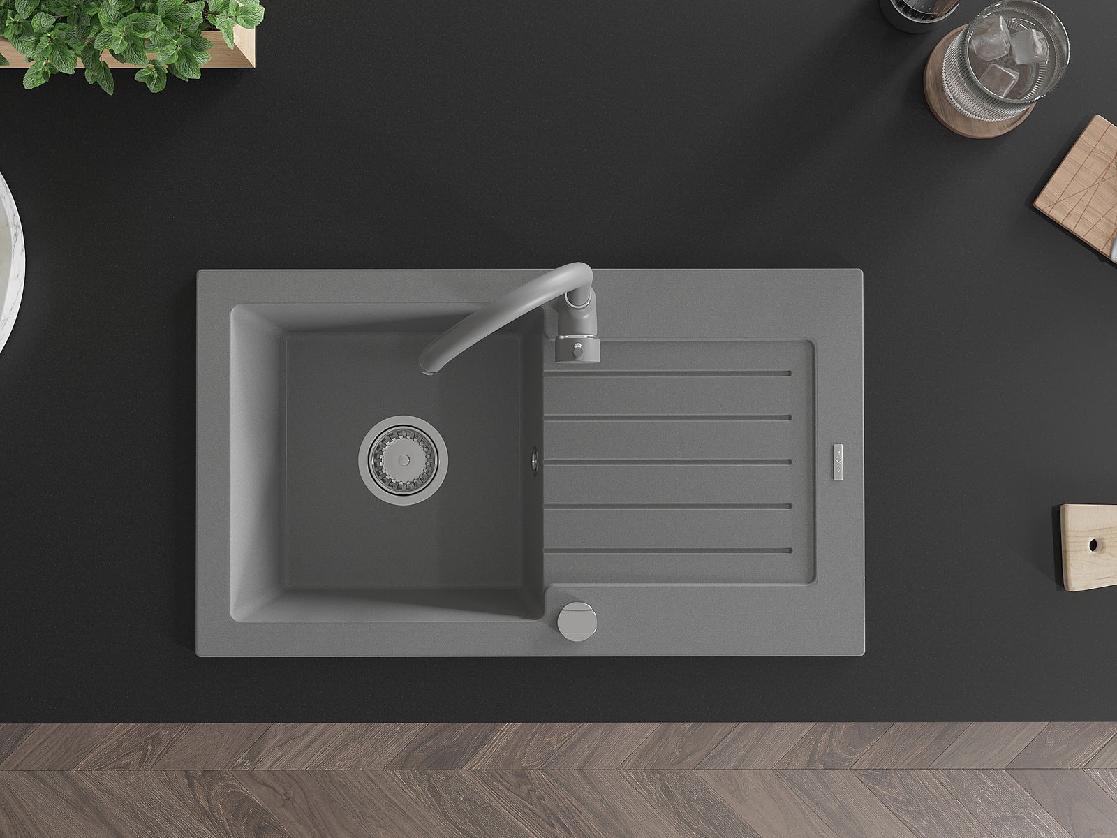 Mexen Pablo granito virtuvės kriauklė su viena kamera ir nusausintuvu bei virtuviniu maišytuvu Telma, pilka - 6510-71-670200-71