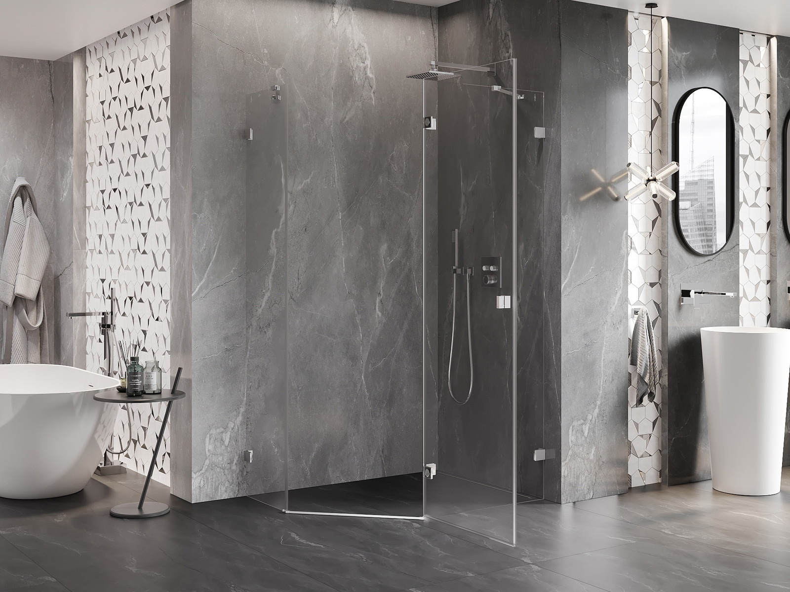 Spaustukai ir vyriai pagaminti iš labai patvaraus žalvario, papildomai sukuriantys lygią stiklo plokštumą. Tai puikus pasirinkimas, jungiantis eleganciją, patvarumą ir šiuolaikinį dizainą. Tokie sprendimai prideda dušo estetikai ir tuo pačiu palengvina švaros palaikymą.