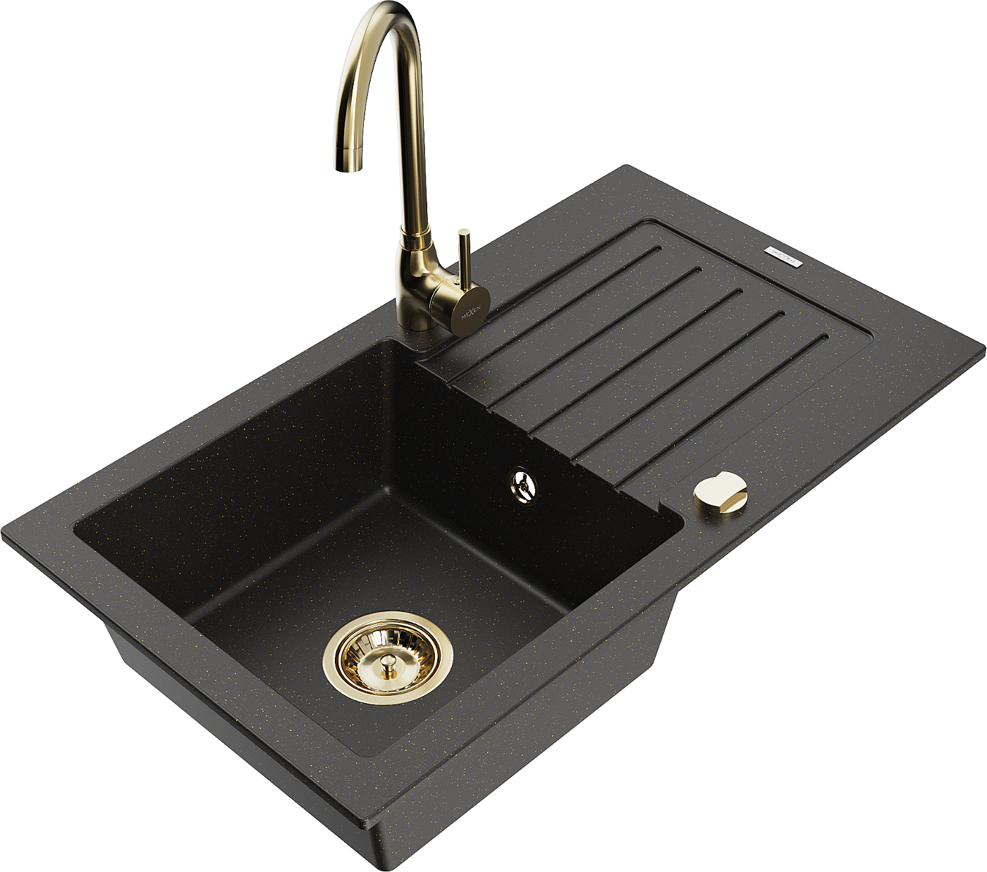 Mexen Pablo granitinė virtuvinė plautuvė su 1 skyriumi ir drenažu bei Telma virtuvės maišytuvu, juoda/auksinė - 6510-75-670200-?