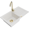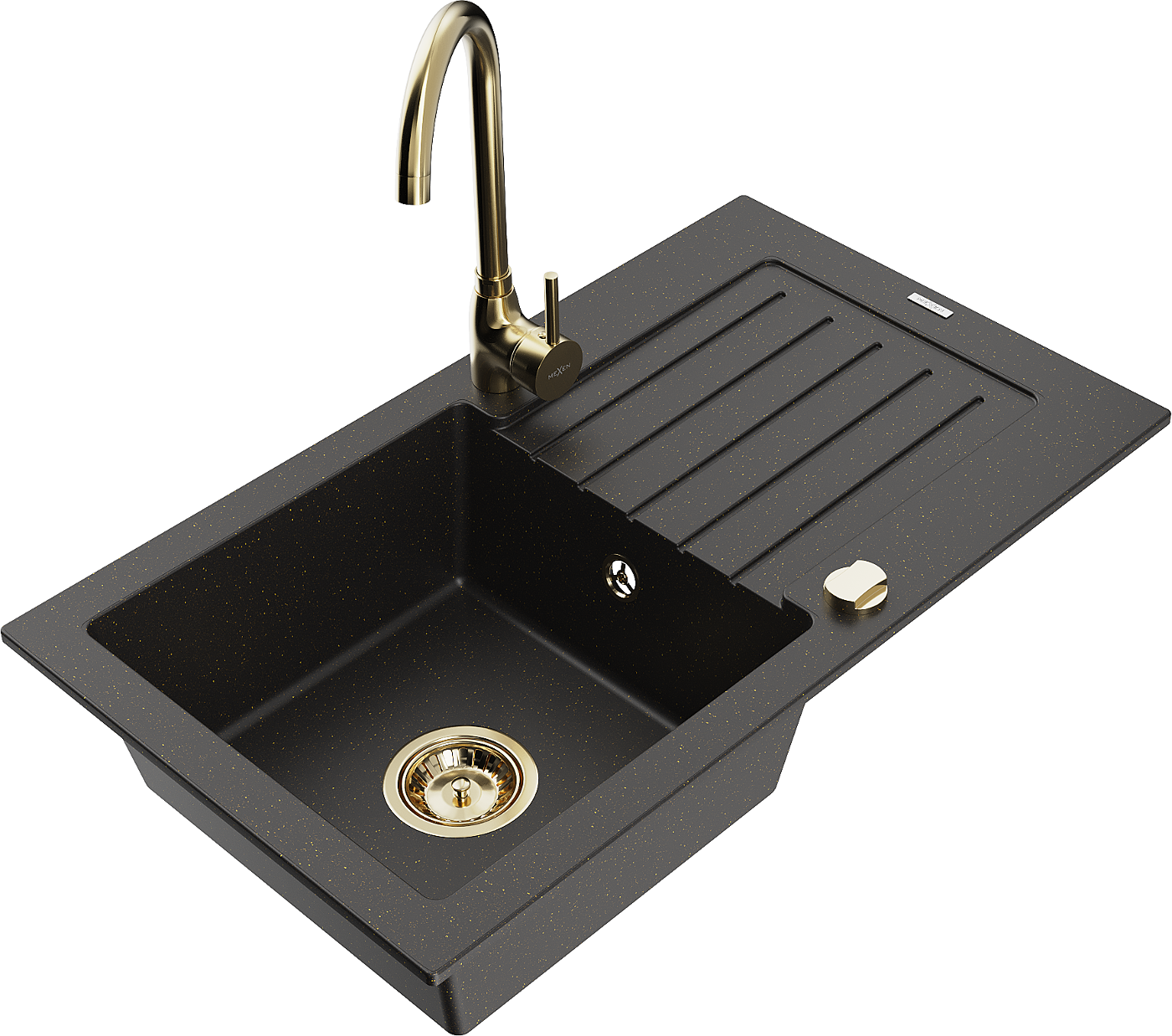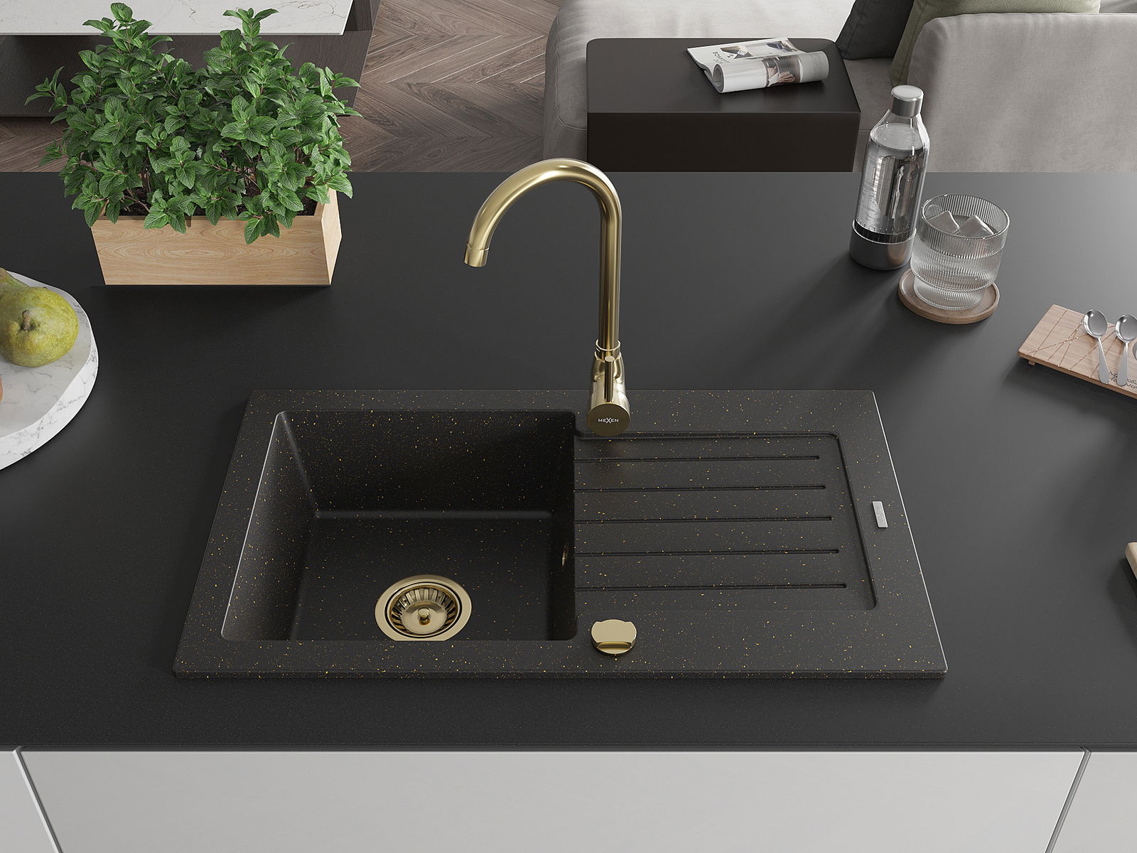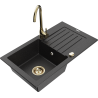 Mexen Pablo granitinė virtuvinė plautuvė su viena kamera ir nusausinimo paviršiumi bei Telma maišytuvu, juodas/auksinis