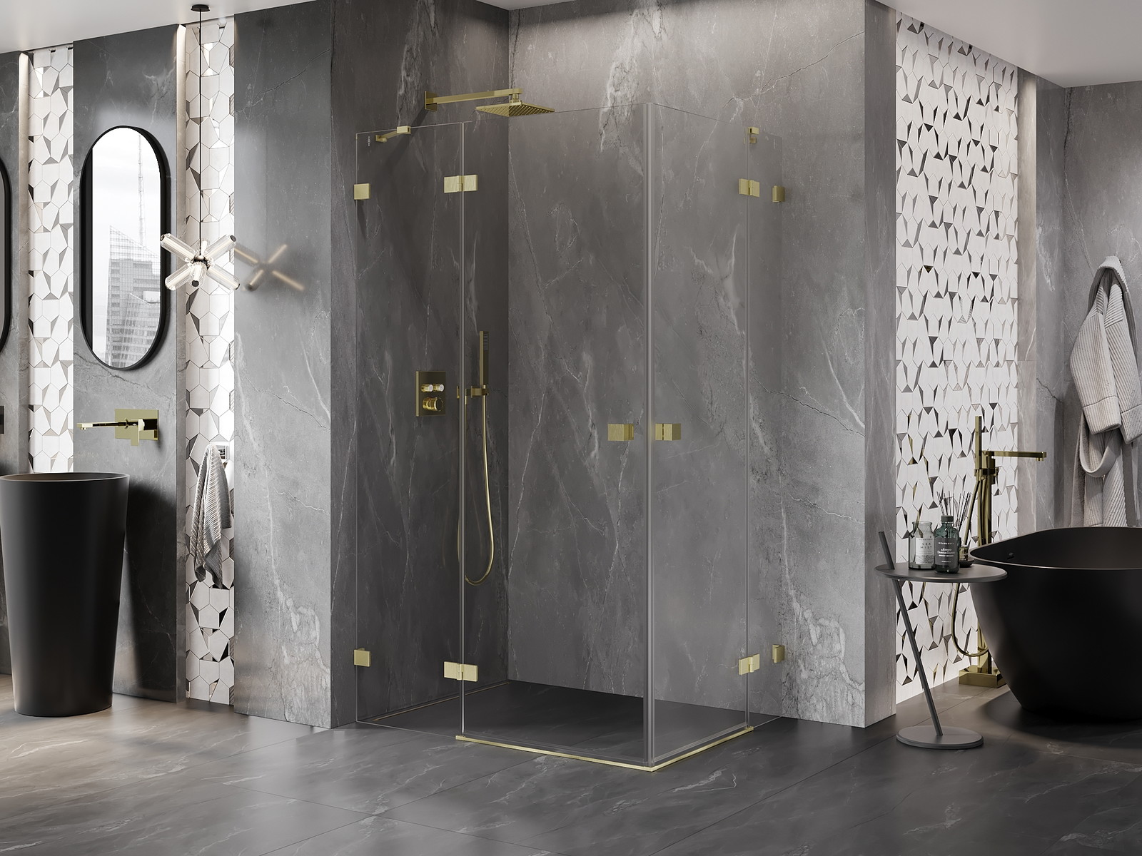 Spaustukai ir vyriai pagaminti iš labai patvaraus žalvario, papildomai sukuriantys lygią stiklo plokštumą. Tai puikus pasirinkimas, jungiantis eleganciją, patvarumą ir šiuolaikinį dizainą. Tokie sprendimai prideda dušo estetikai ir tuo pačiu palengvina švaros palaikymą.