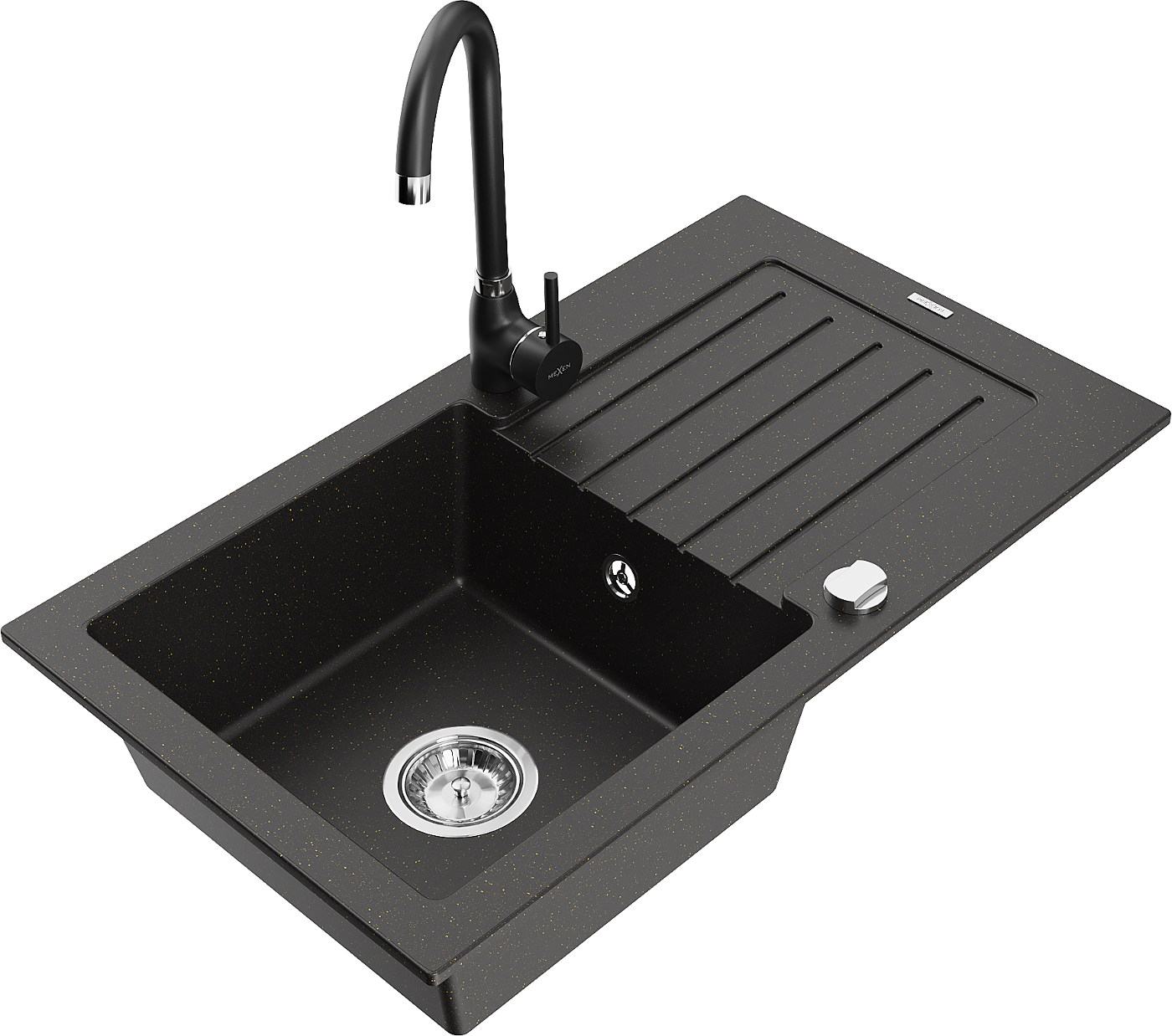 Mexen Pablo granitinis vienos kameros plautuvė su nutekėjimu ir virtuvės maišytuvu Telma, juoda/auksinė - 6510-75-670200-70
