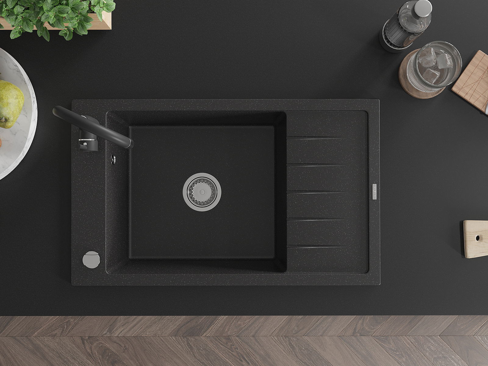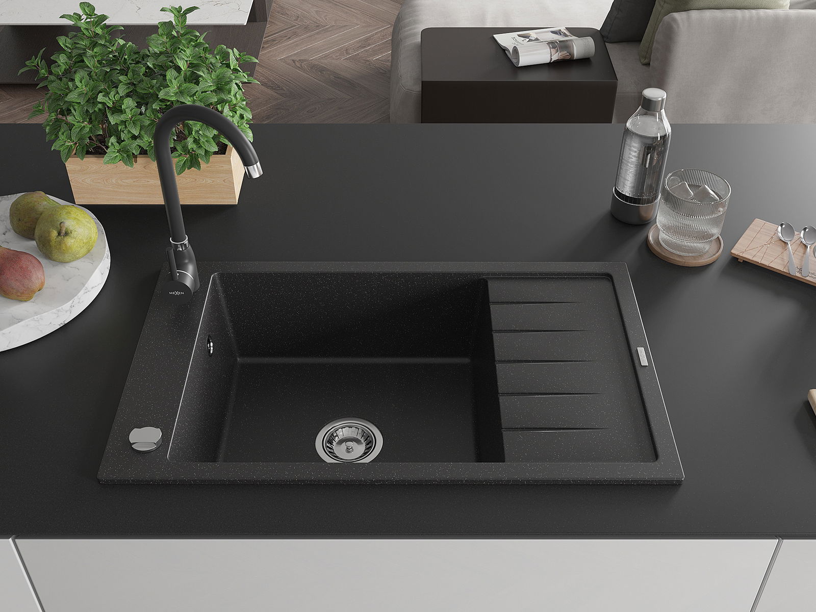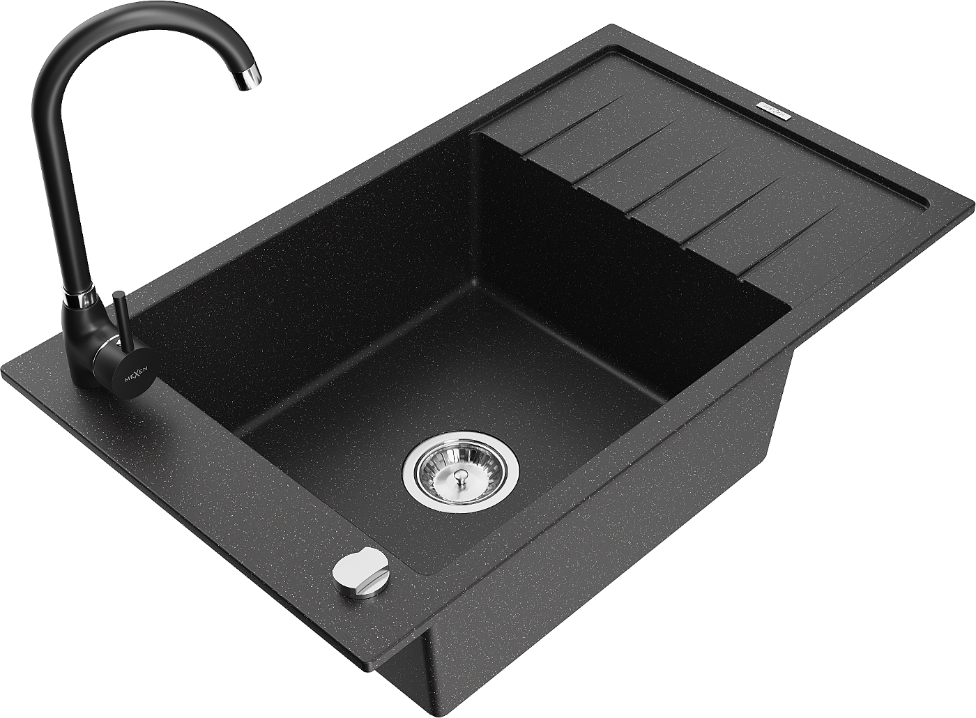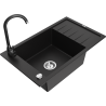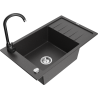 Mexen Elias grindinis vienos kameros plautuvas su nutekėjimo zona ir virtuvės baterija Telma, juodas/sidabrinis