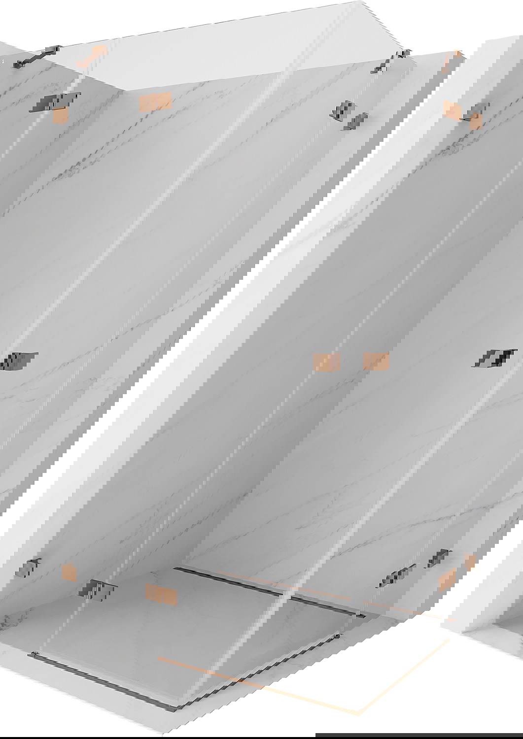 Spaustukai ir vyriai pagaminti iš labai patvaraus žalvario, papildomai sukuriantys lygią stiklo plokštumą. Tai puikus pasirinkimas, jungiantis eleganciją, patvarumą ir šiuolaikinį dizainą. Tokie sprendimai prideda dušo estetikai ir tuo pačiu palengvina švaros palaikymą.