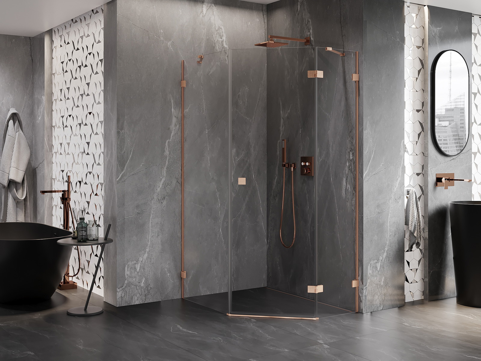Spaustukai ir vyriai pagaminti iš labai patvaraus žalvario, papildomai sukuriantys lygią stiklo plokštumą. Tai puikus pasirinkimas, jungiantis eleganciją, patvarumą ir šiuolaikinį dizainą. Tokie sprendimai prideda dušo estetikai ir tuo pačiu palengvina švaros palaikymą.