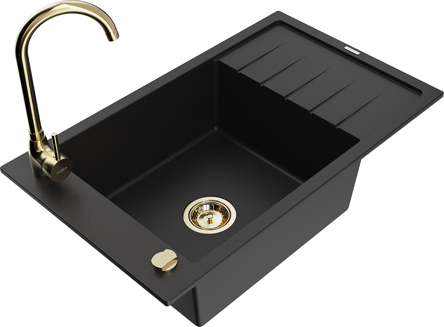 Mexen Elias granitinis kriauklė su viena dubeniu ir nusausintuvu bei virtuviniu maišytuvu Telma, juodas - 6511-77-670200-50