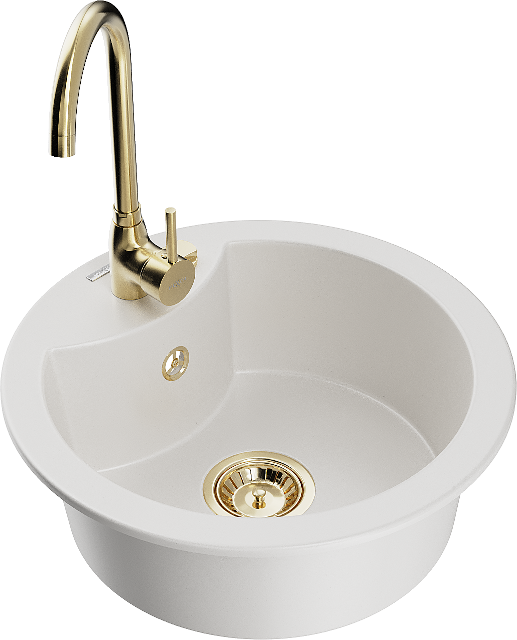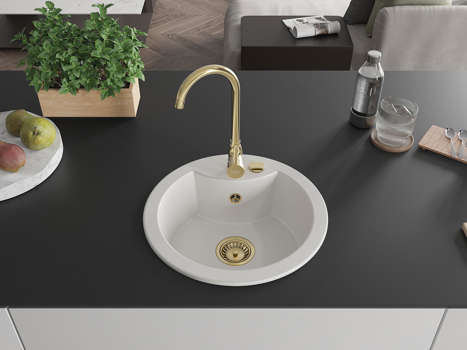 Mexen Diego granito virtuvinis kriauklė 1 kameros su virtuviniu maišytuvu Telma, baltas - 6512-20-670200-50