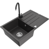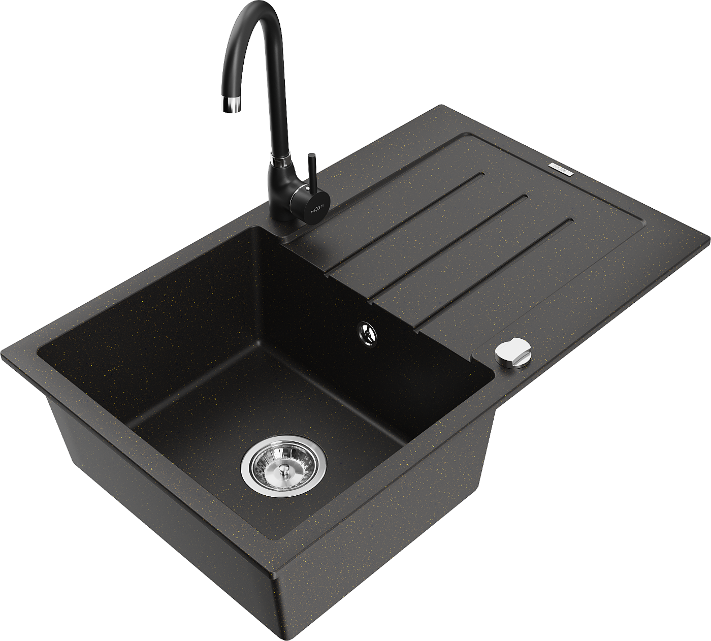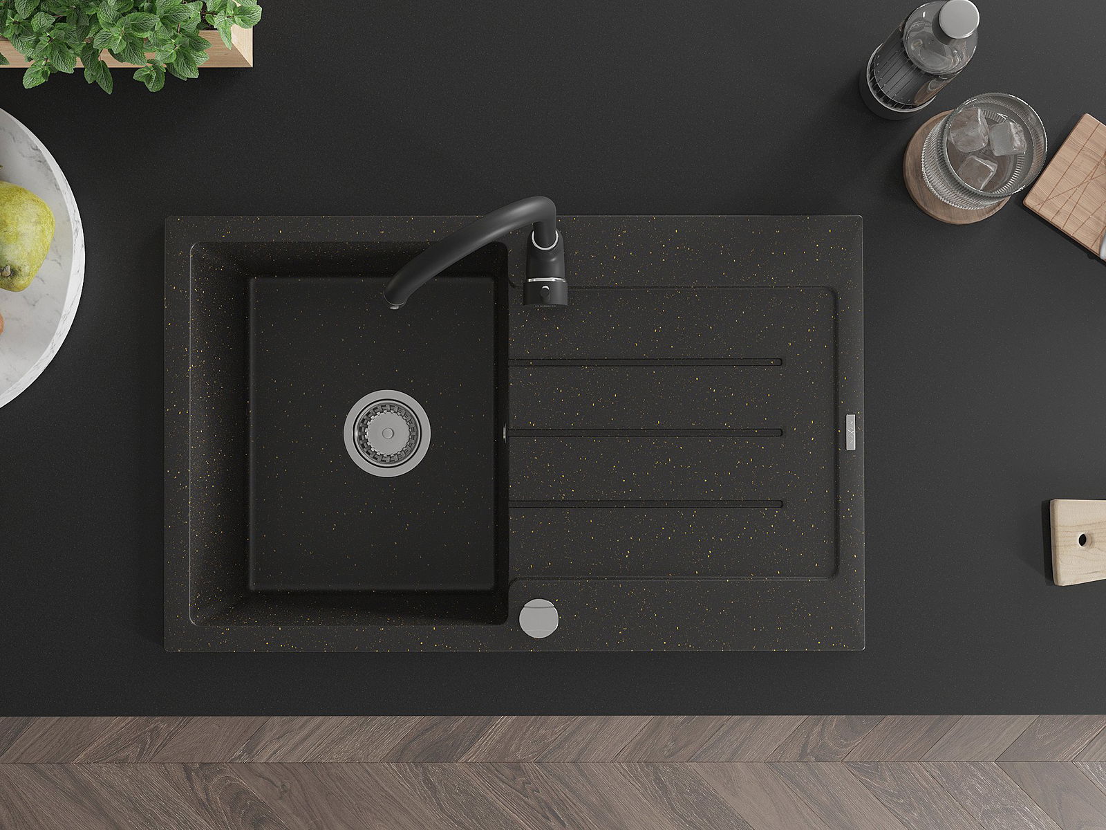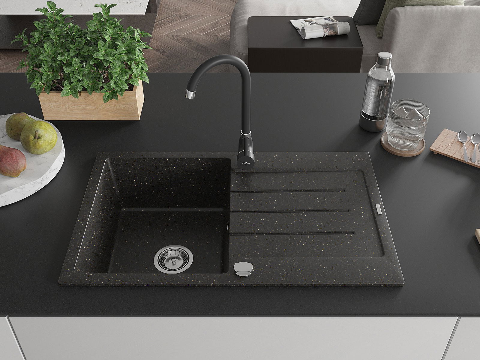 Mexen Bruno vienos dubenėlės granitinė kriauklė su nutekėjimu ir virtuviniu maišytuvu Telma, juoda/auksinė