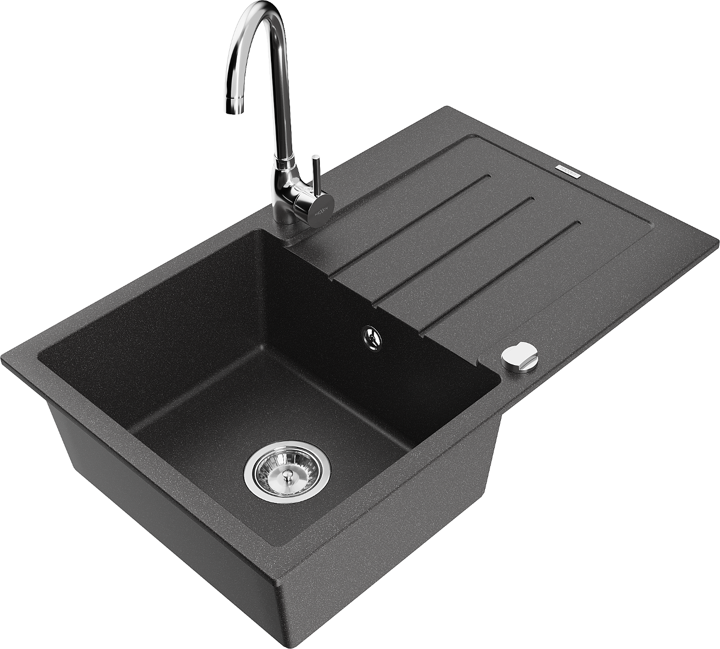 Mexen Bruno granitinė plautuvė su vienu dubeniu, nubėgikliu ir virtuviniu maišytuvu Telma, juoda dėmėta