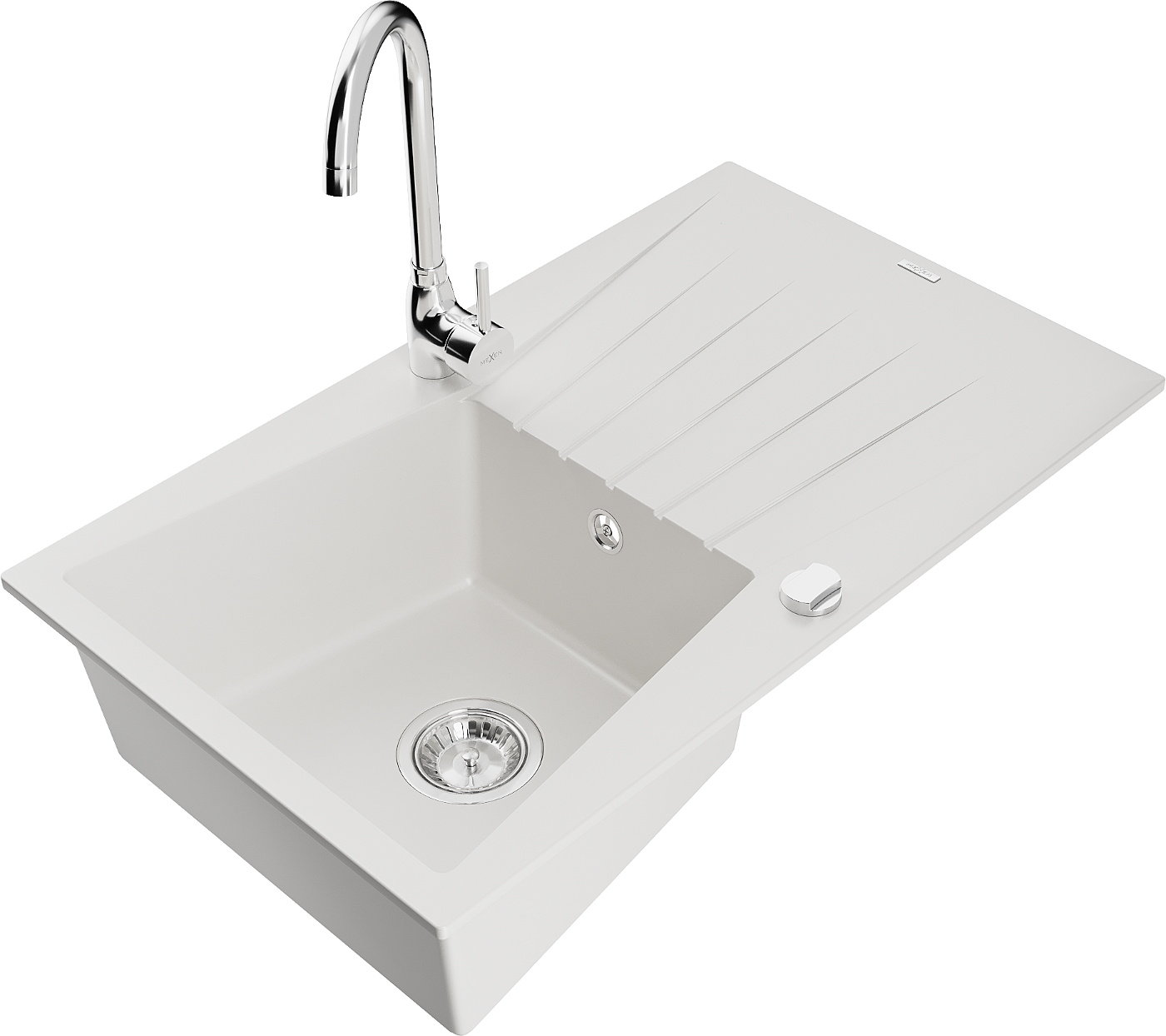 Mexen Cesar granito plautuvė su viena kamera ir nusausinamu stalčiumi bei Telma virtuviniu maišytuvu, balta - 6514-20-670200-00