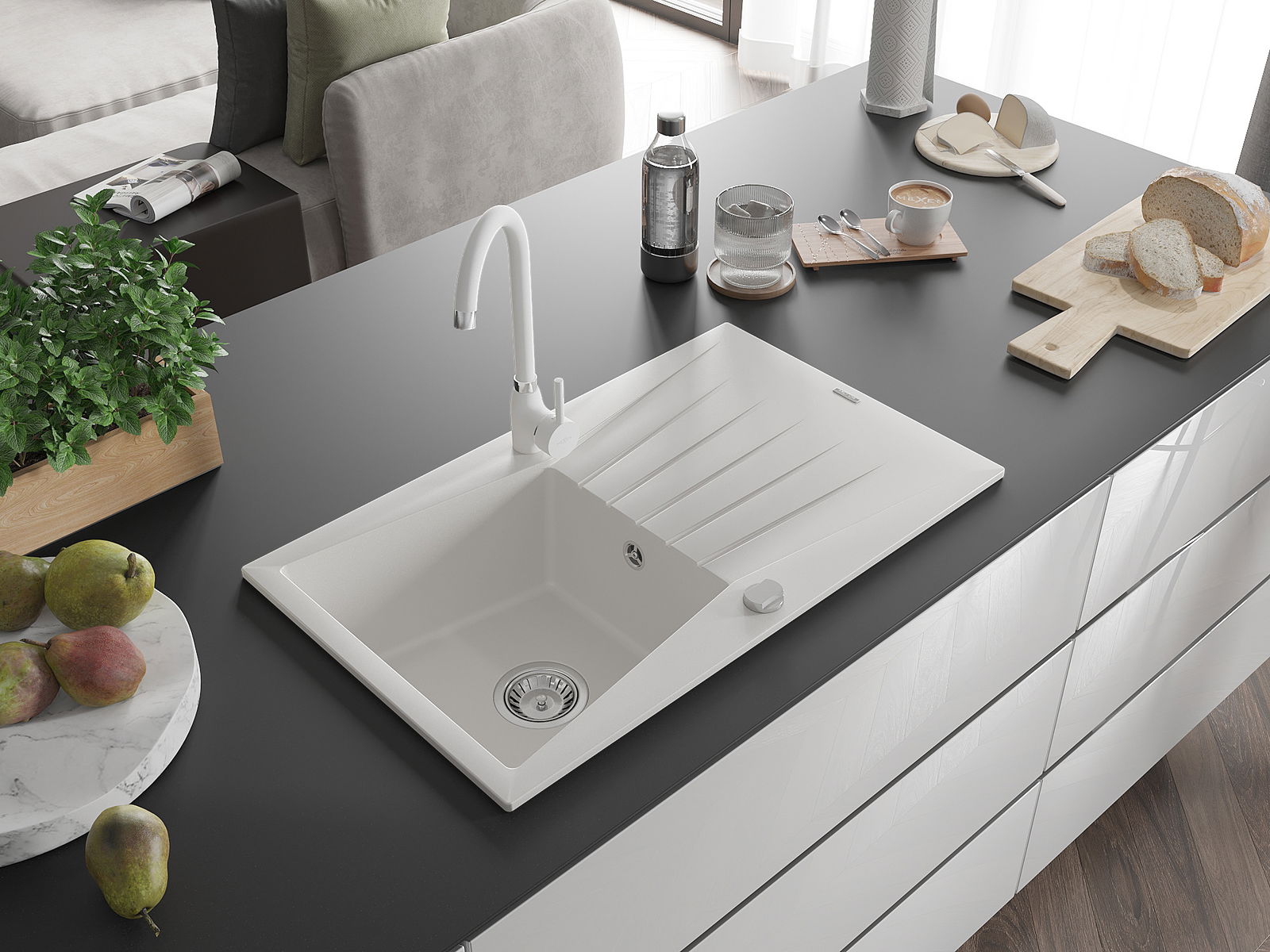 Mexen Cesar granito plautuvė su vienu dubeniu, lašintuvu ir virtuviniu čiaupu Telma, balta - 6514-20-670200-20