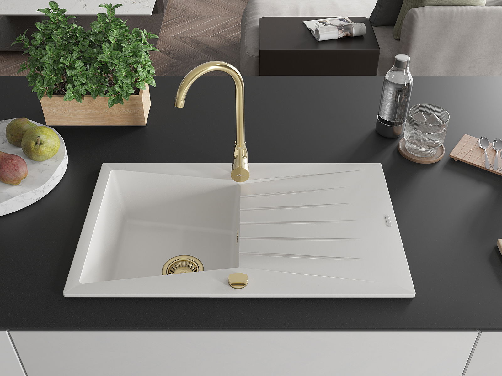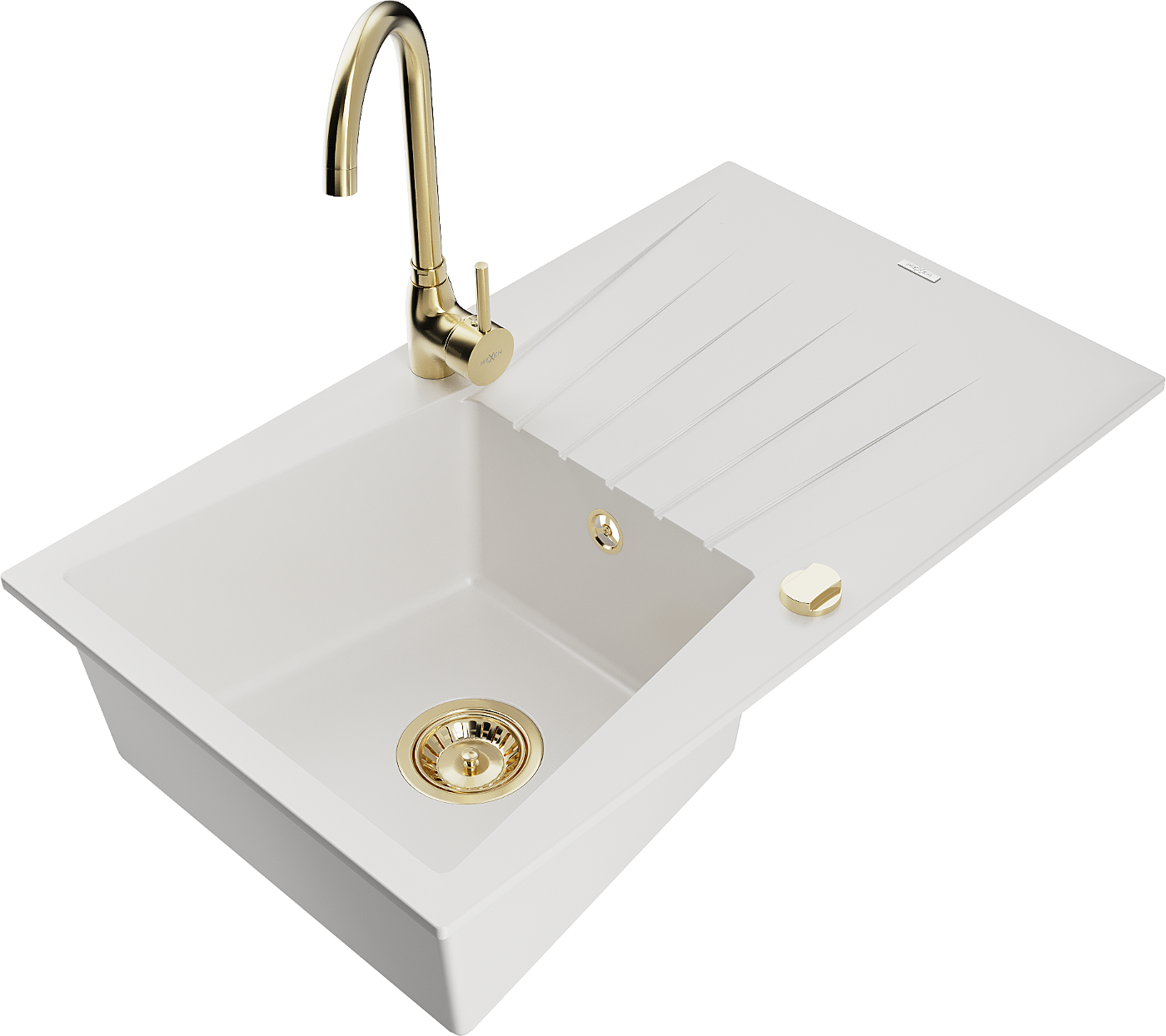 Mexen Cesar 1-komorinis granitinis plautuvas su nusausinimo lentyna ir virtuviniu maišytuvu Telma, baltas - 6514-20-670200-50