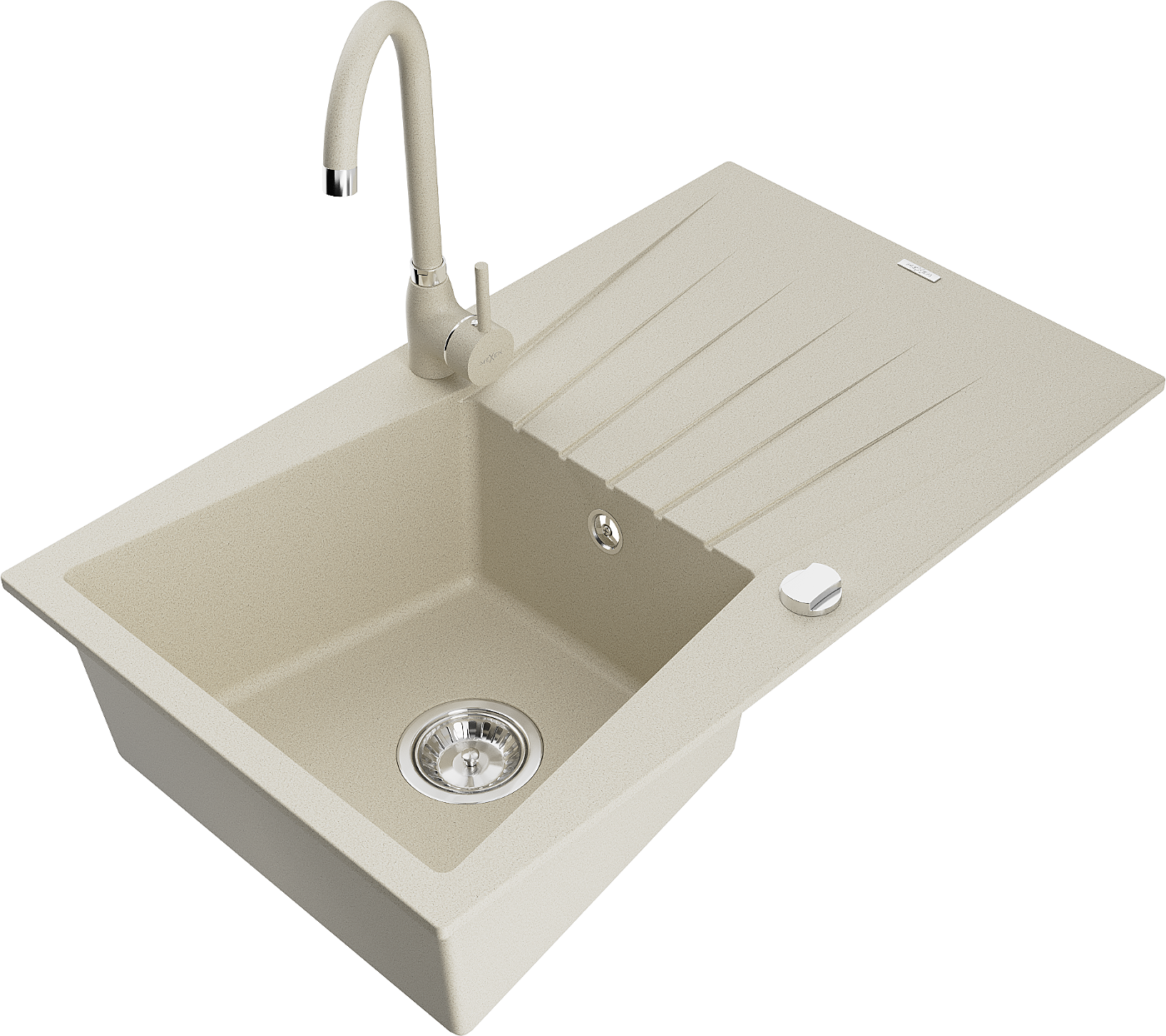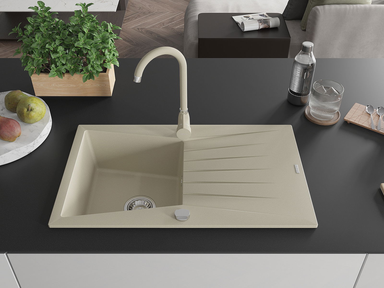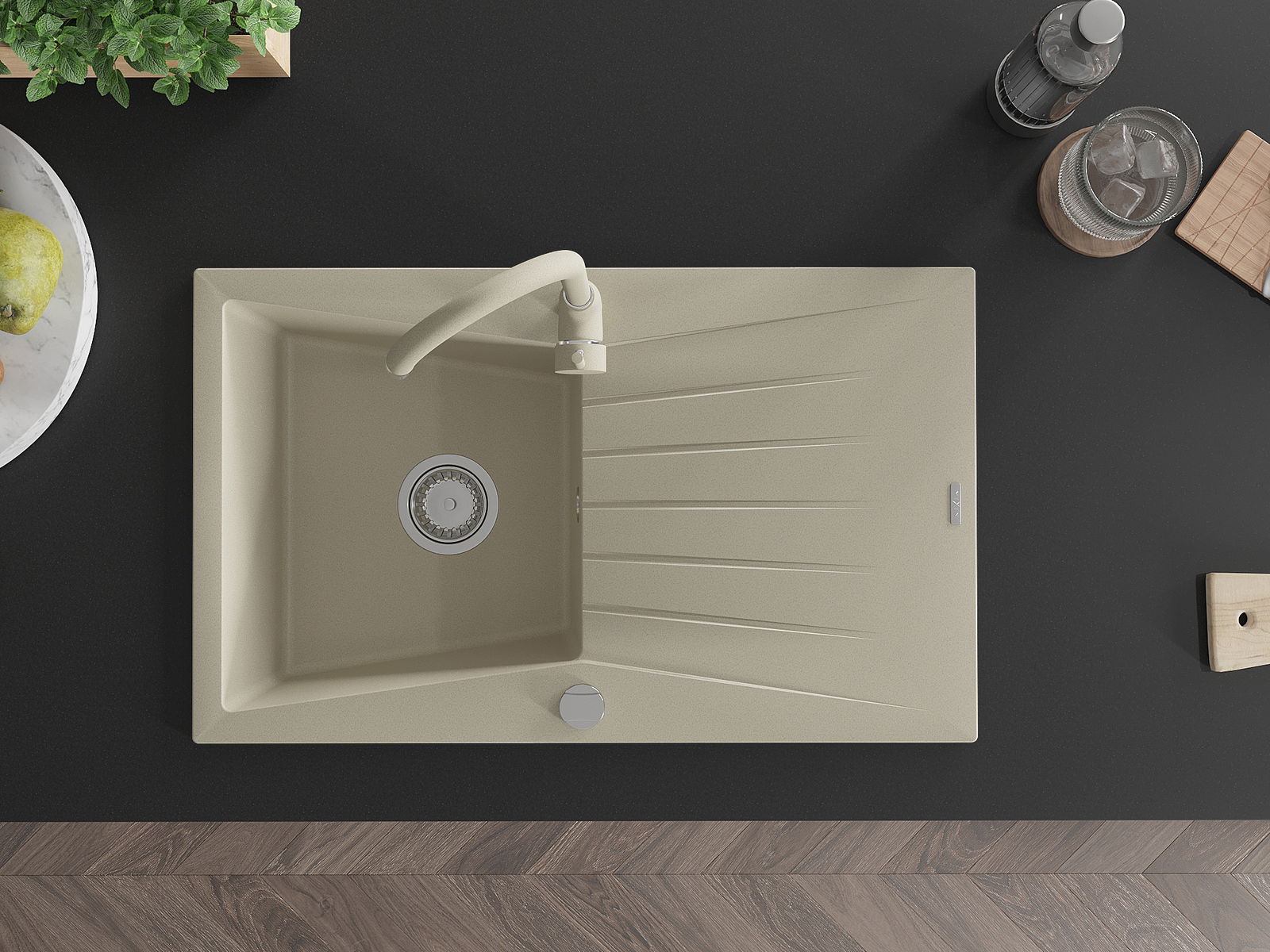 Mexen Cesar viena dubens granitinė plautuvė su nusausintuvu ir virtuvės maišytuvu Telma, smėlio spalvos - 6514-69-670200-69