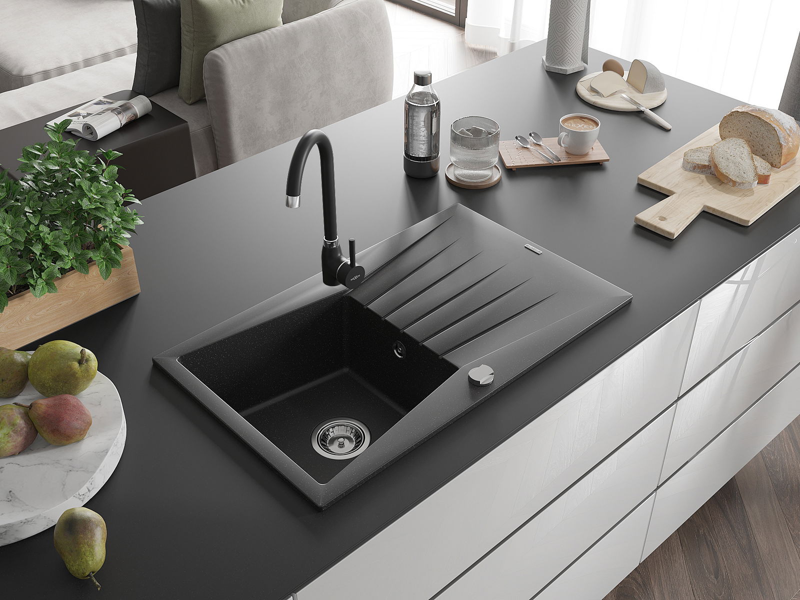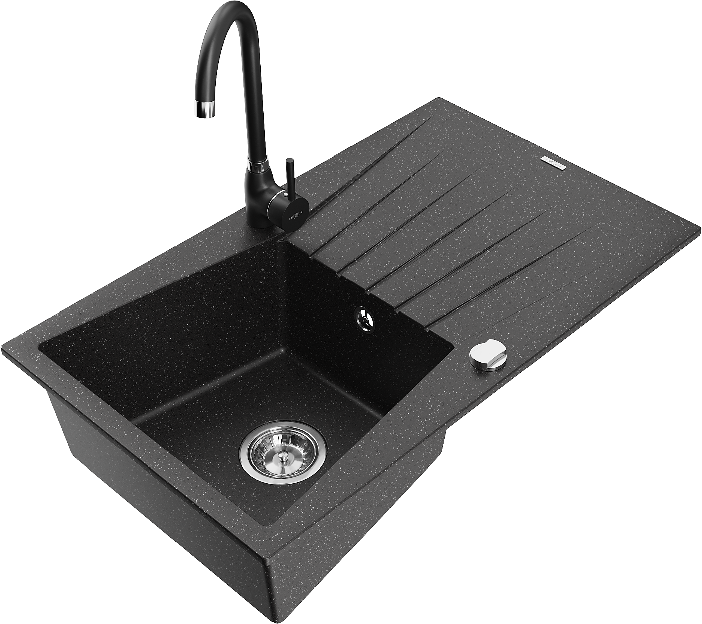 Mexen Cesar granitinė kriauklė su 1 skyriumi ir nutekėjimu bei virtuviniu maišytuvu Telma, juoda/sidabrinė - 6514-73-670200-70