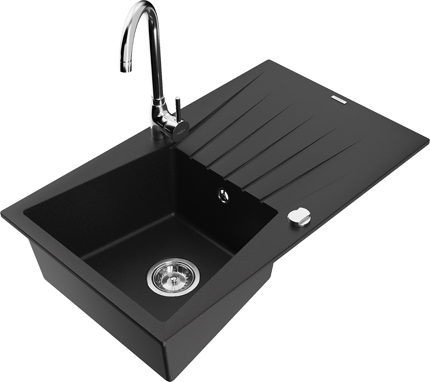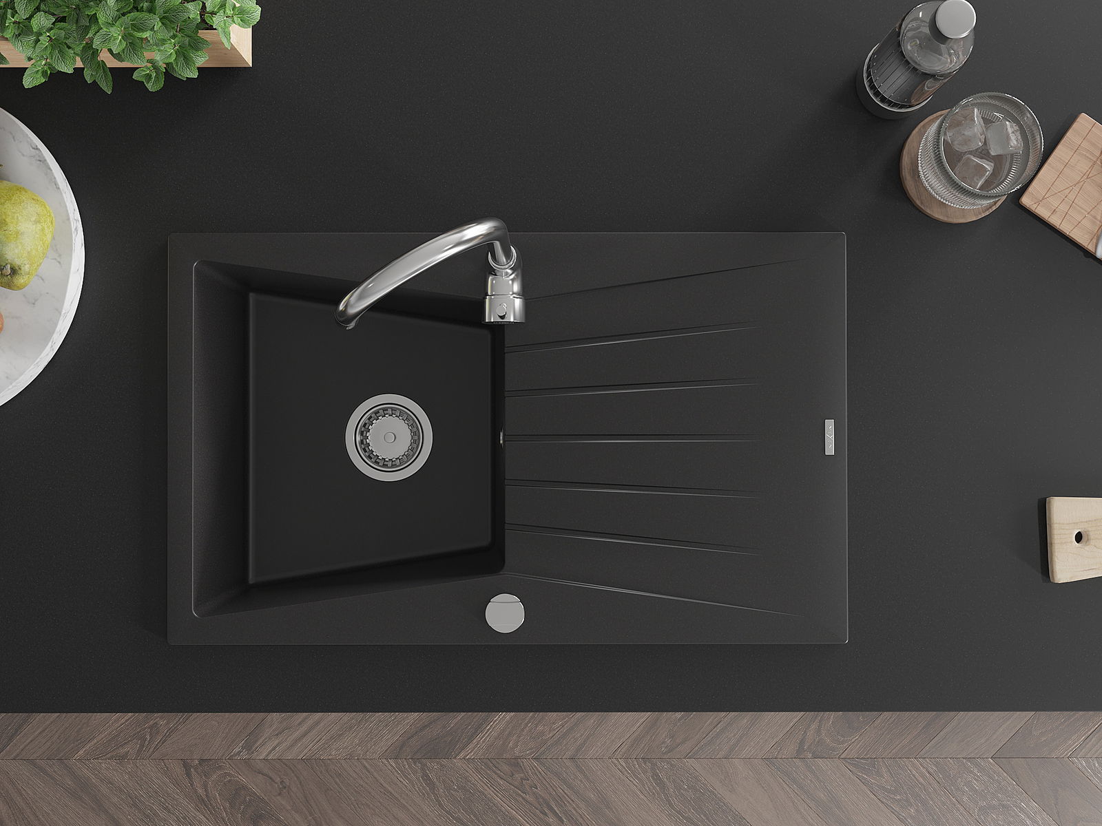 Mexen Cesar granitinė vienos kameros kriauklė su nusausintuvu ir virtuviniu maišytuvu Telma, juoda - 6514-77-670200-00