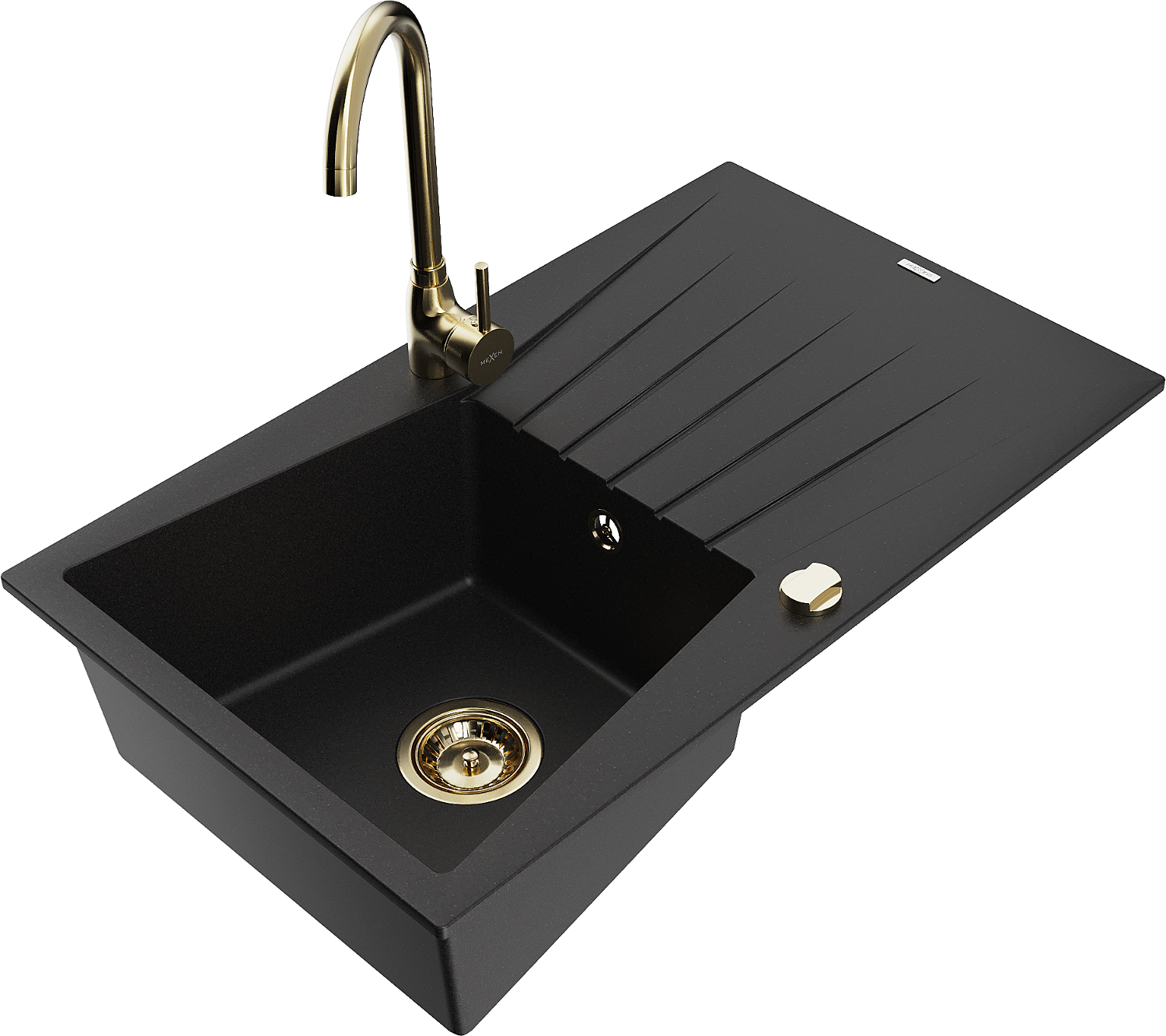 Mexen Cesar granitinė vienos kameros kriauklė su nusausintuvu ir virtuvės maišytuvu Telma, juoda - 6514-77-670200-50
