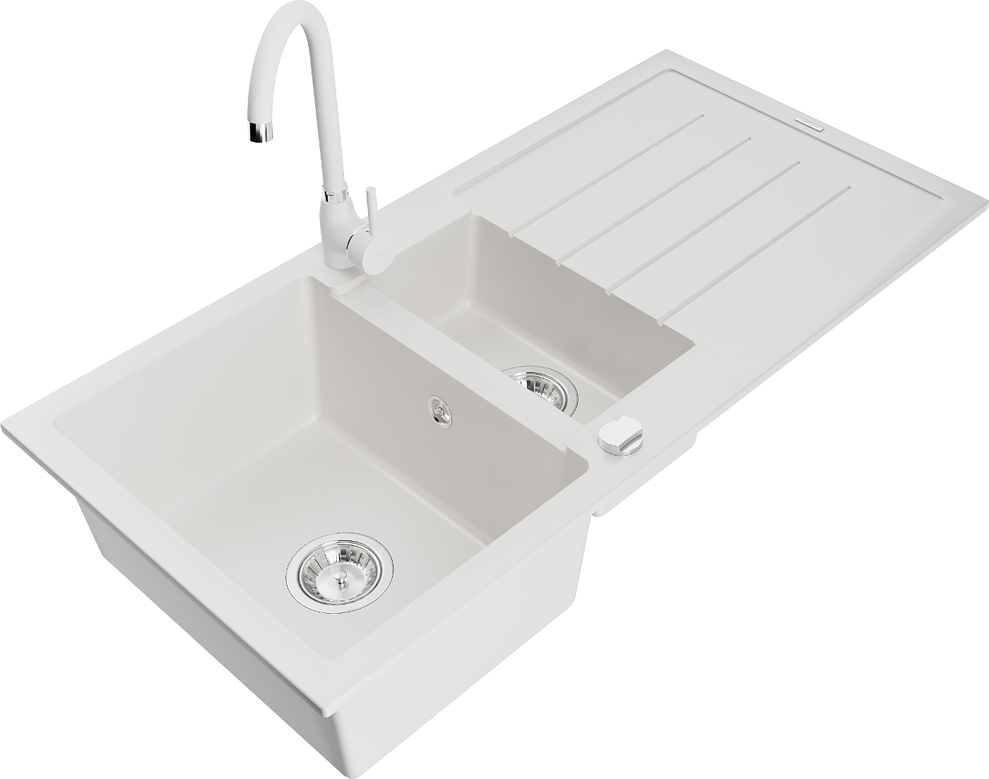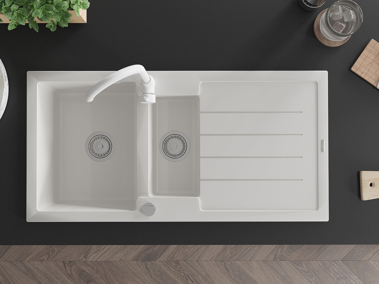 Mexen Andres granitinė 1,5-skylių virtuvės kriauklė su nutekamuoju padėklu ir Telma virtuviniu maišytuvu, balta