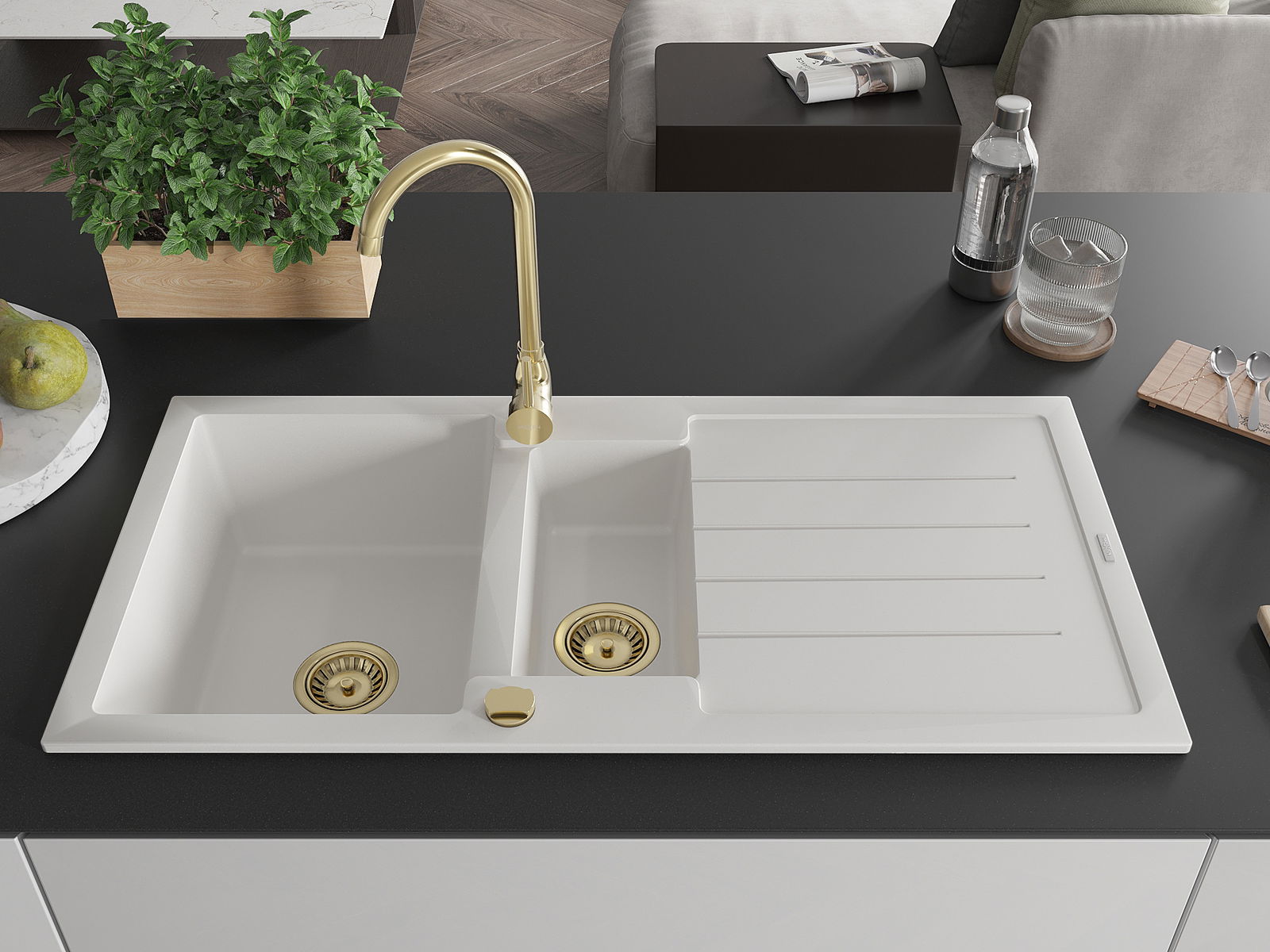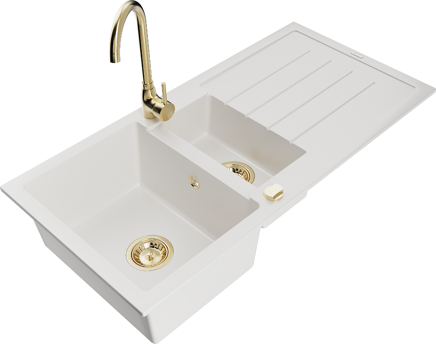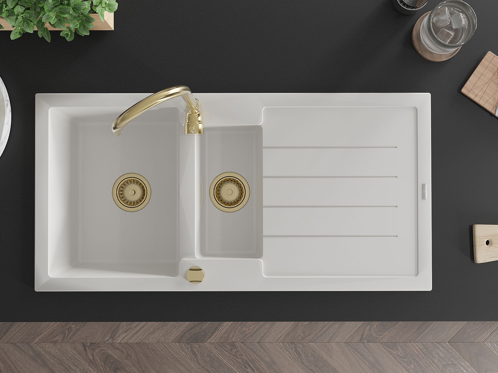 Mexen Andres granito plautuvė 1,5 skyrių su nusausintuvu ir virtuviniu maišytuvu Telma, balta - 6515-20-670200-50