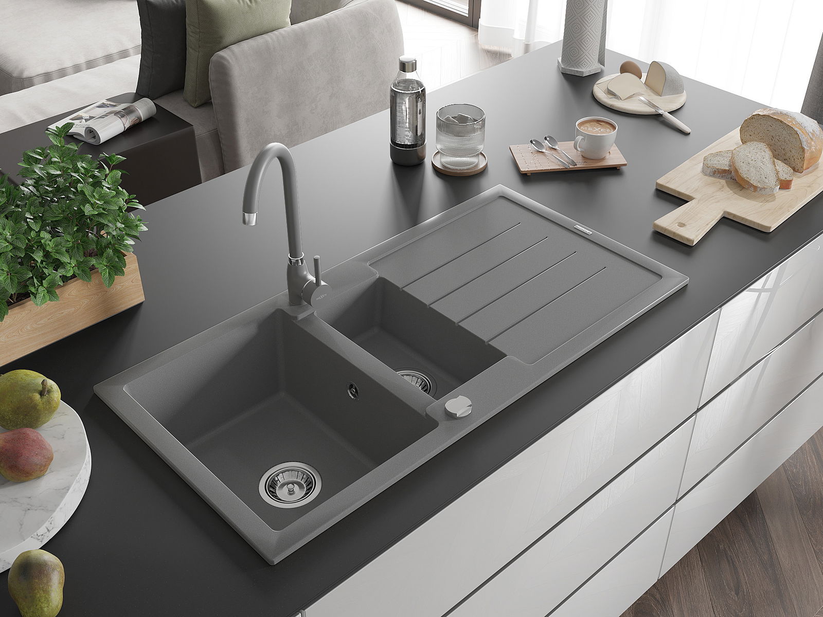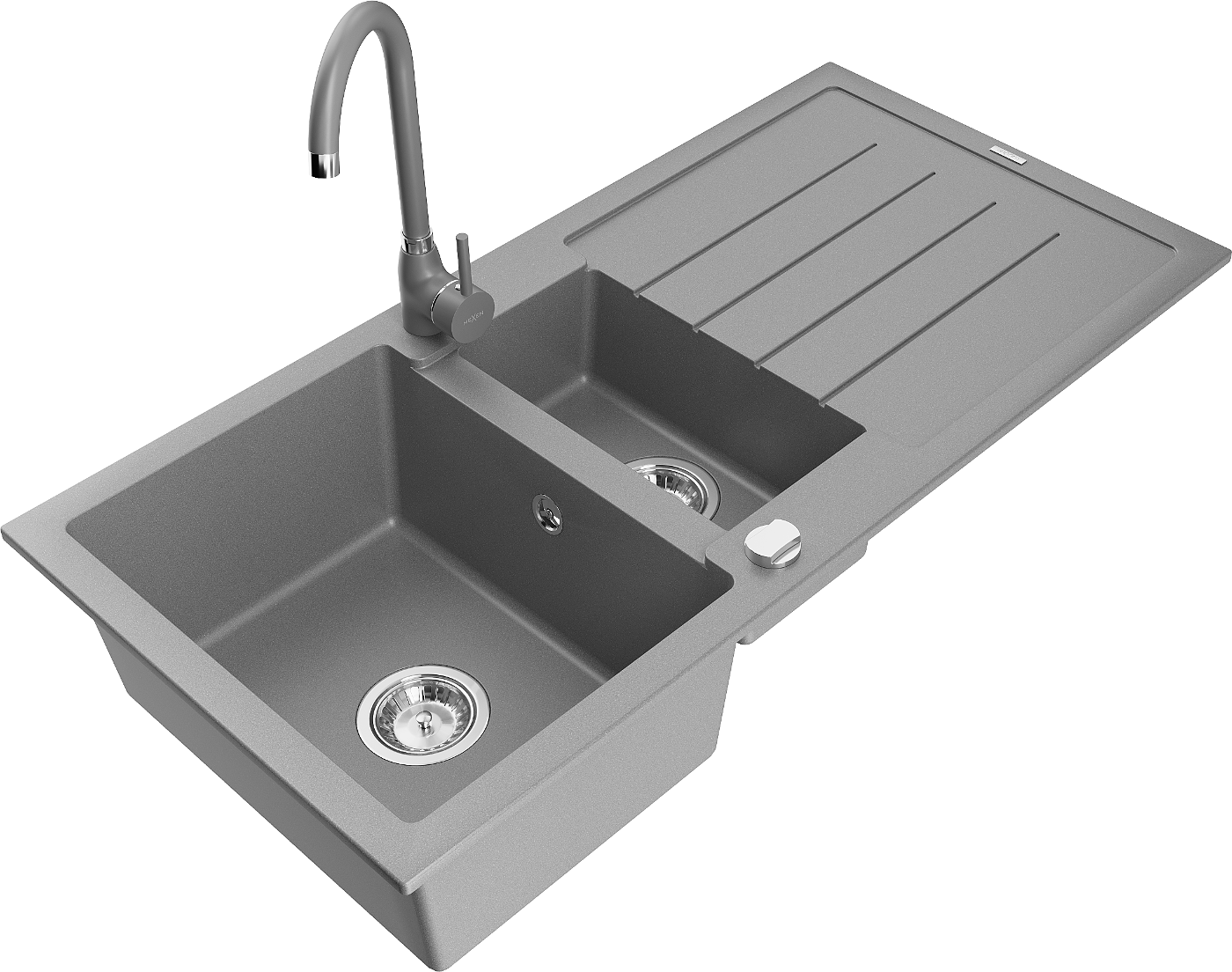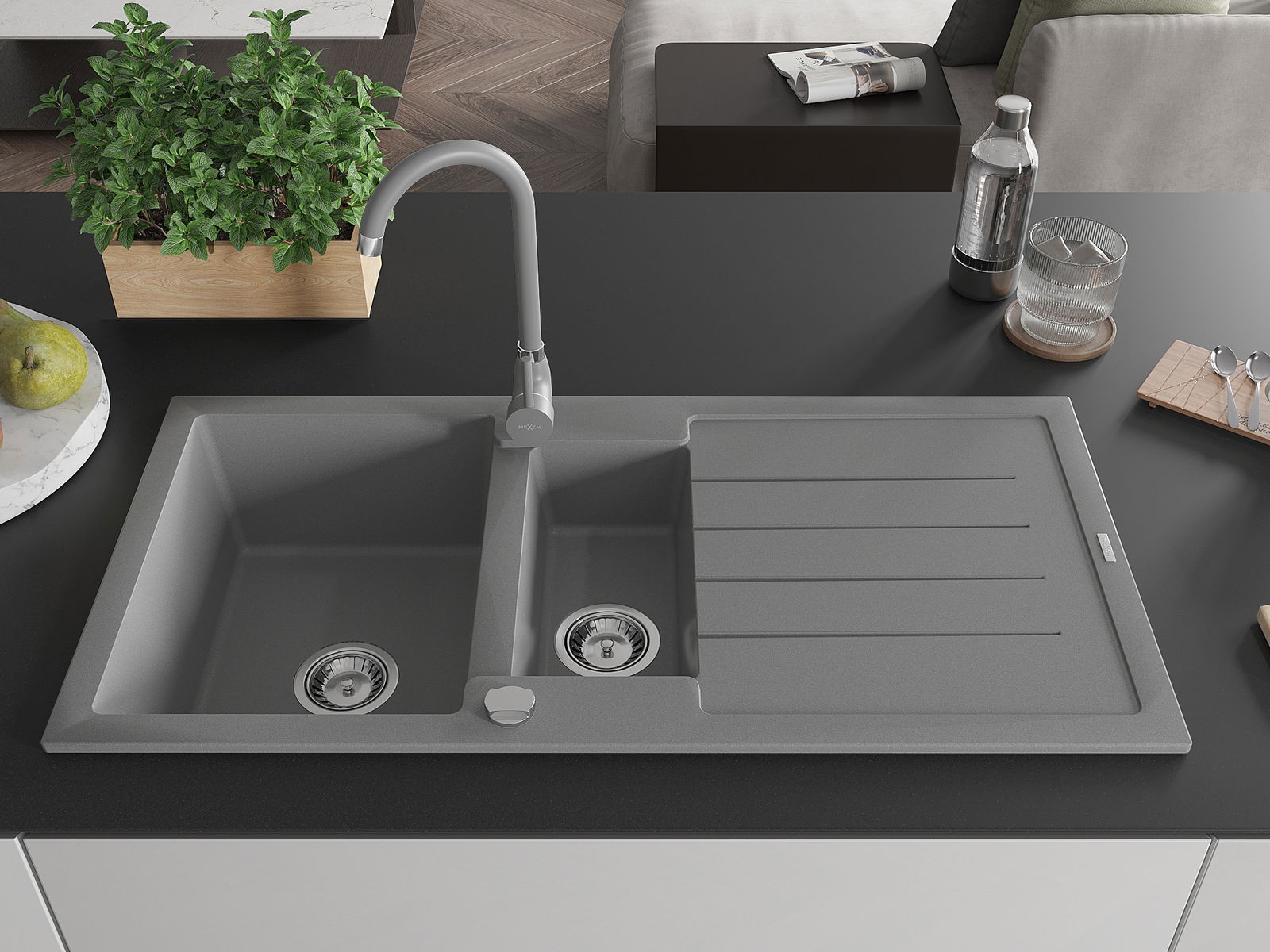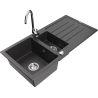 Mexen Andres granitinė praustuvė 1,5 skylių su nusausintuvu ir virtuviniu maišytuvu Telma, pilka - 6515-71-670200-71