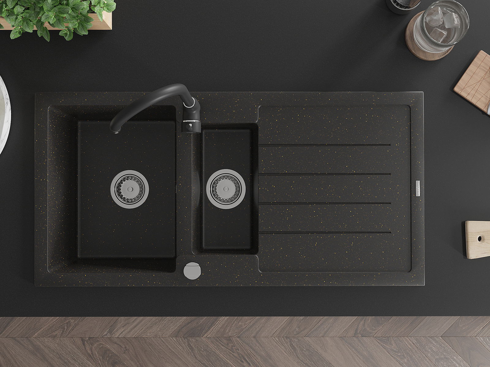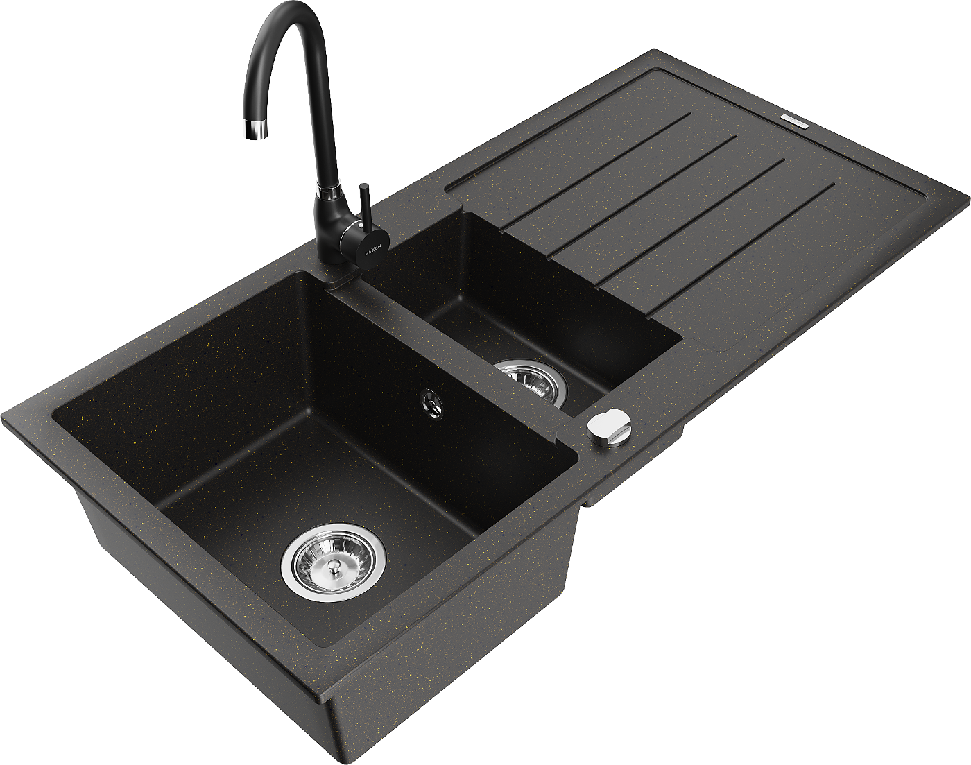 Mexen Andres granitinė kriauklė 1,5 skyriaus su nusausintuvu ir virtuviniu maišytuvu Telma, juoda/auksinė - 6515-75-670200-70