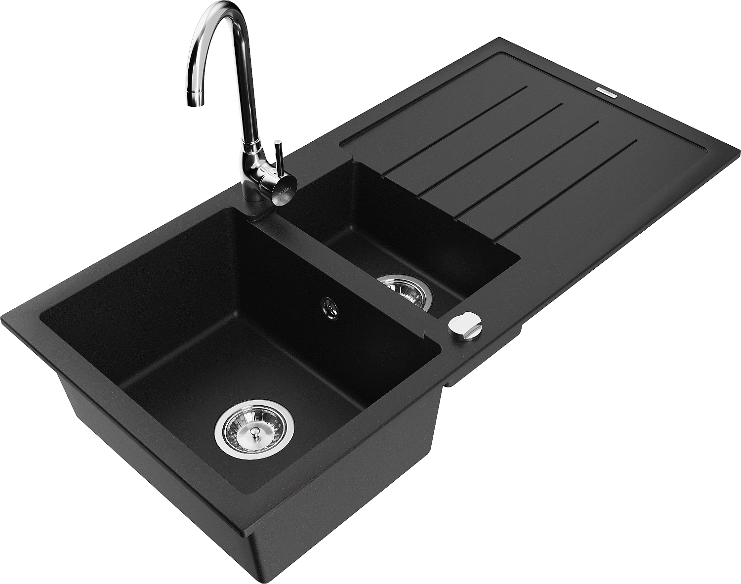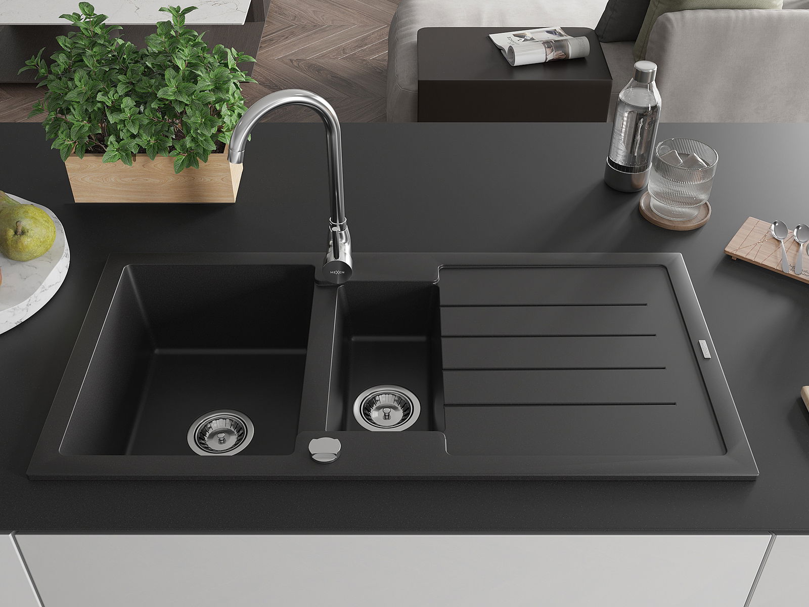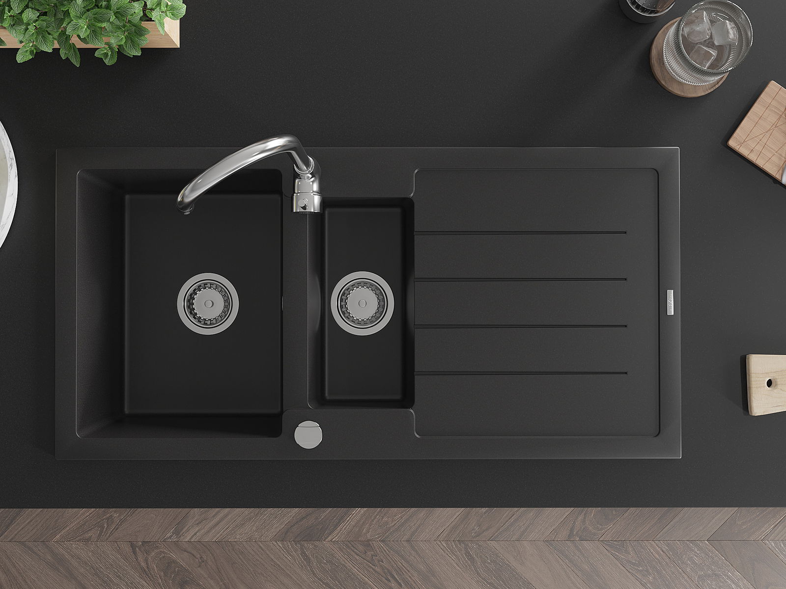 Mexen Andres granitinė plautuvė 1,5 skylių su lašintuvu ir virtuviniu maišytuvu Telma, juoda - 6515-77-670200-00