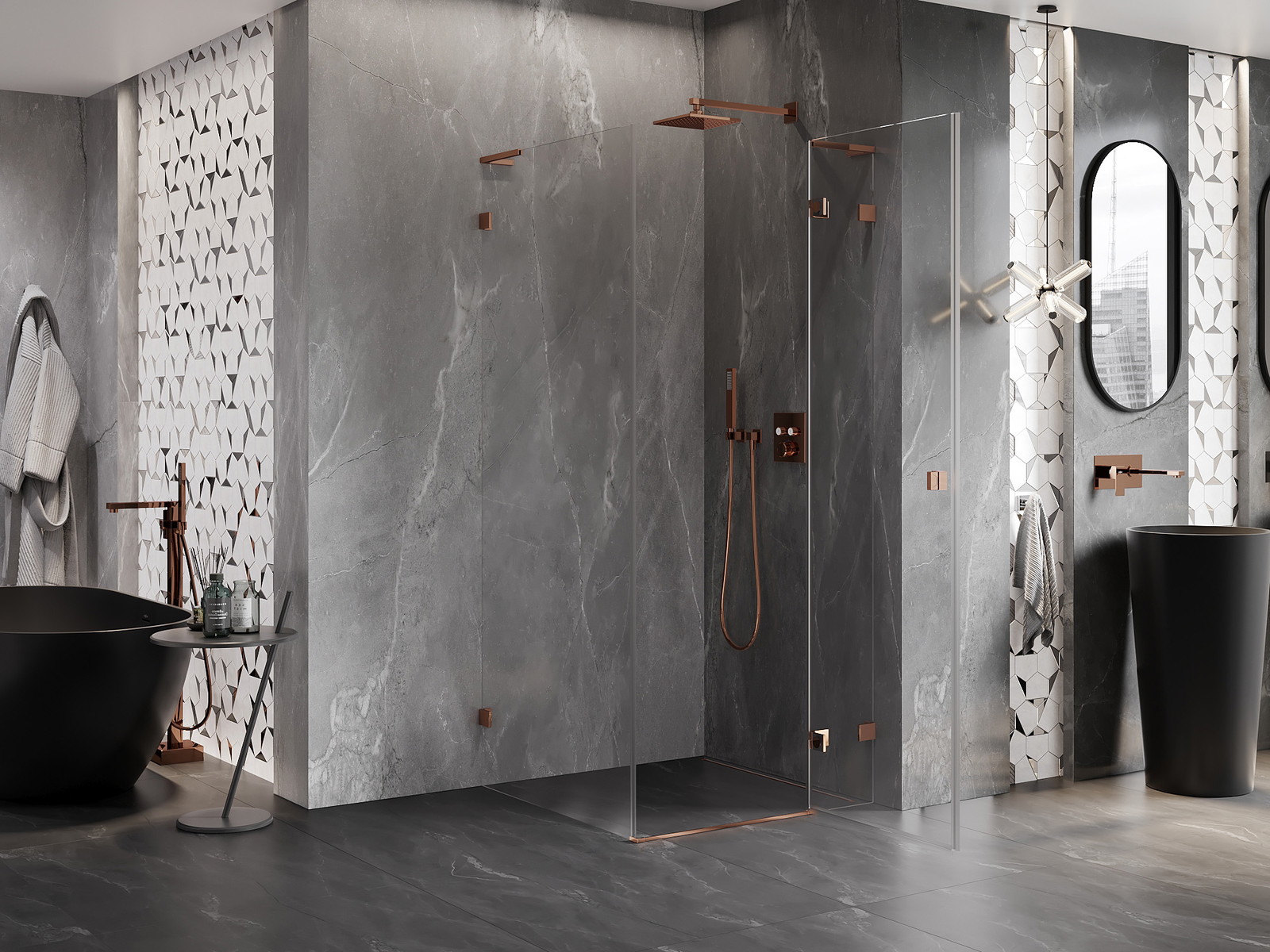 Spaustukai ir vyriai pagaminti iš labai patvaraus žalvario, papildomai sukuriantys lygią stiklo plokštumą. Tai puikus pasirinkimas, jungiantis eleganciją, patvarumą ir šiuolaikinį dizainą. Tokie sprendimai prideda dušo estetikai ir tuo pačiu palengvina švaros palaikymą.