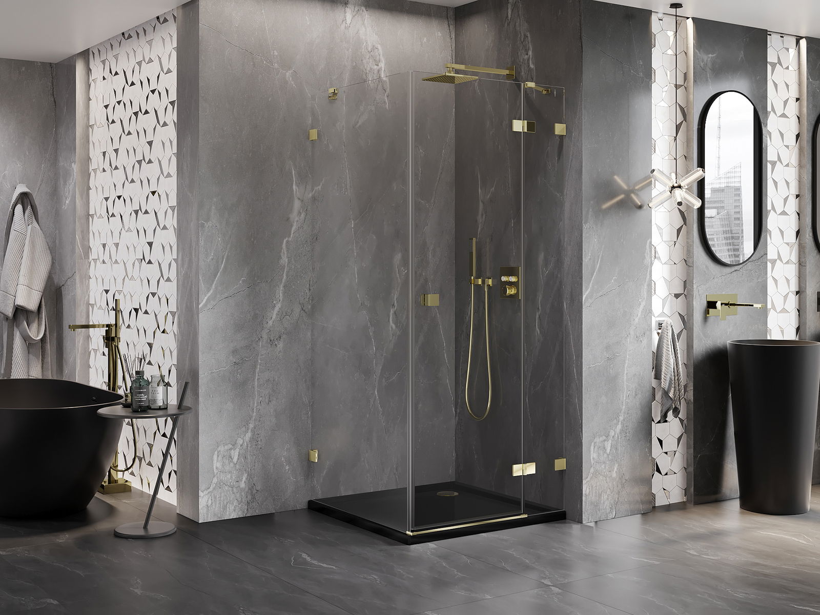 Spaustukai ir vyriai pagaminti iš labai patvaraus žalvario, papildomai sukuriantys lygią stiklo plokštumą. Tai puikus pasirinkimas, jungiantis eleganciją, patvarumą ir šiuolaikinį dizainą. Tokie sprendimai prideda dušo estetikai ir tuo pačiu palengvina švaros palaikymą.