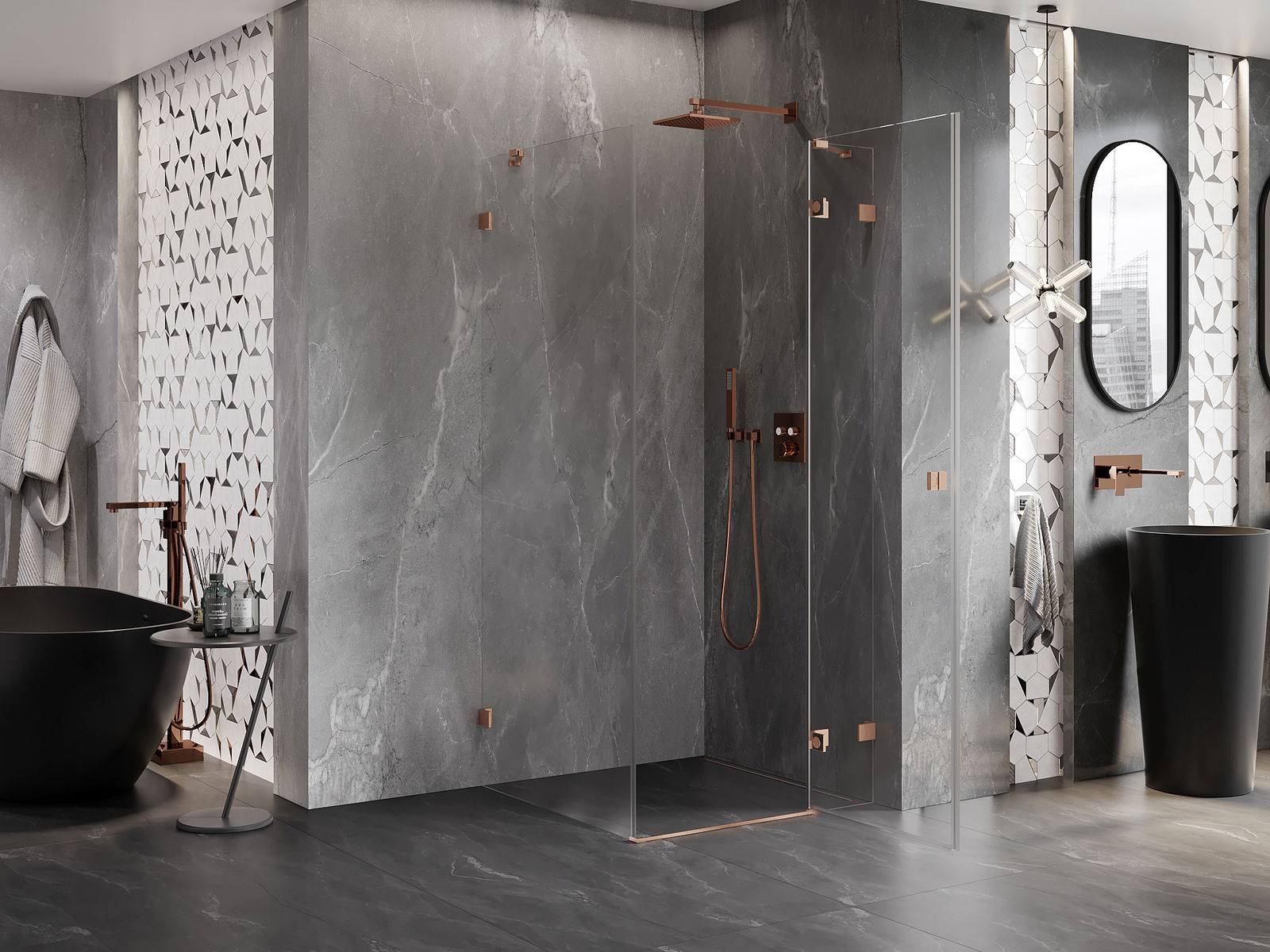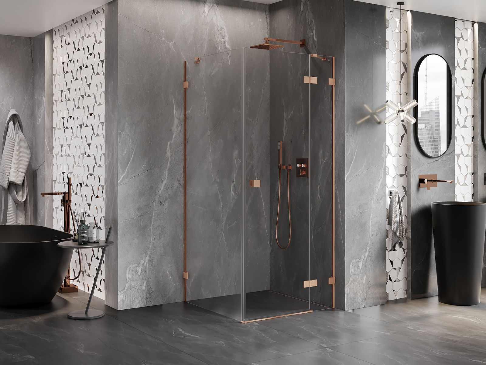 Spaustukai ir vyriai pagaminti iš labai patvaraus žalvario, papildomai sukuriantys lygią stiklo plokštumą. Tai puikus pasirinkimas, jungiantis eleganciją, patvarumą ir šiuolaikinį dizainą. Tokie sprendimai prideda dušo estetikai ir tuo pačiu palengvina švaros palaikymą.