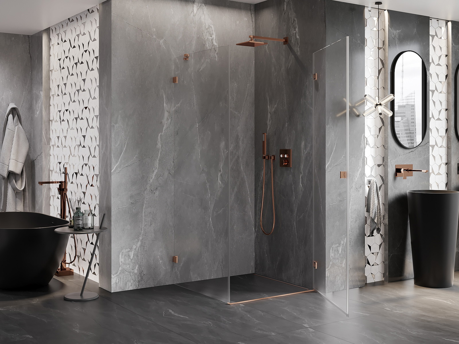 Mexen Lunar-B atveriama dešinė dušo kabina 100 x 100 cm, skaidri, šepečiu valyta varis - 832-100-100-65-00-P