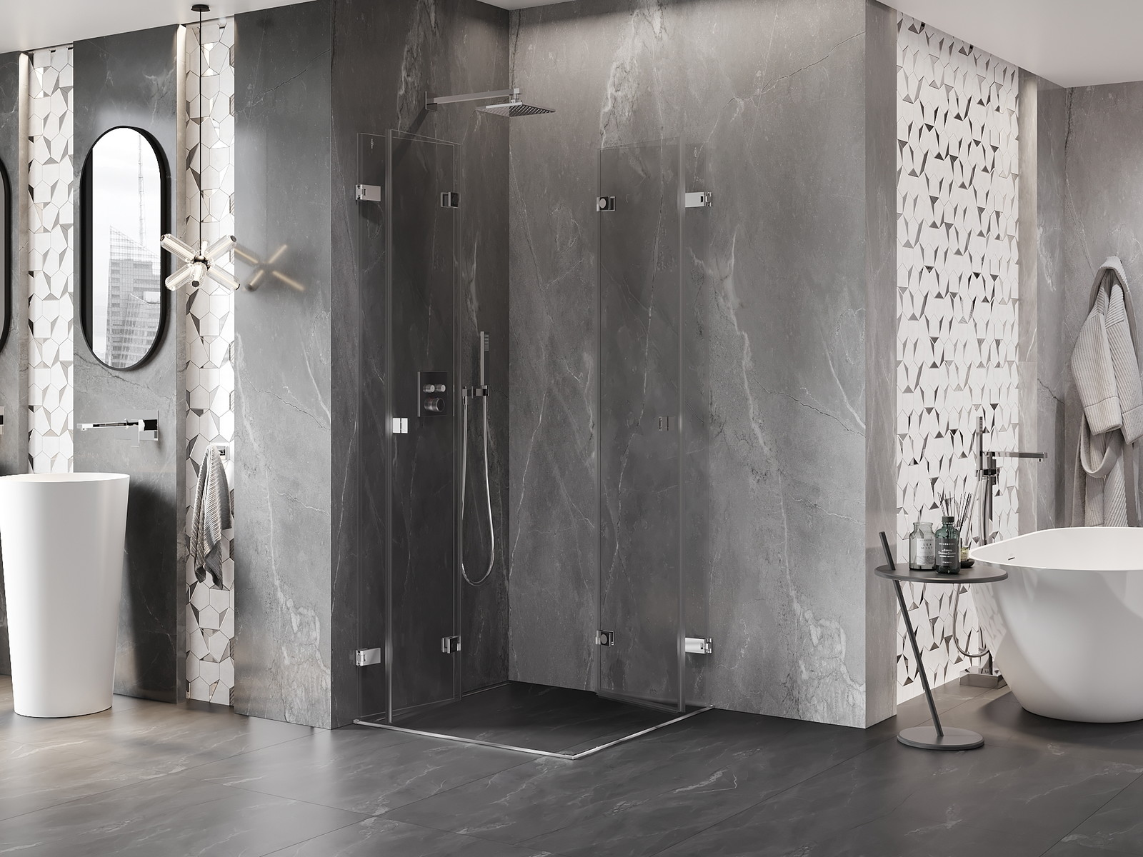 Galimybė sulenkti duris, tiek į išorę, tiek į vidų, leidžia gauti daugiau erdvės nenaudojant dušo. Tai yra idealus sprendimas mažesnėms vonios kambariams, maksimaliai išnaudojantis turimą plotą.