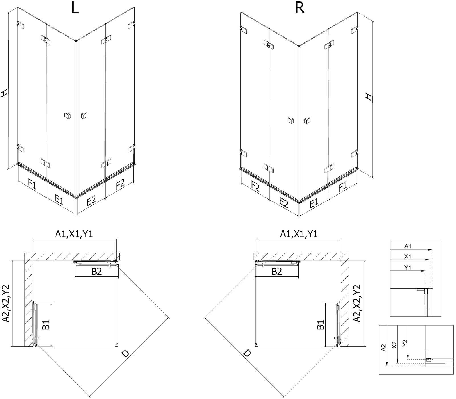 Dušo kabinos, durys ir sienelės yra standartiškai pritaikytos montuoti ant nustatytų matmenų dušo padėklų. Būtent šie matmenys nurodomi gaminio pavadinime arba aprašyme. Tačiau atkreipkite dėmesį, kad faktiniai elementų matmenys gali šiek tiek skirtis nuo vardinių verčių. Planuojant montuoti tiesiai ant grindų, rekomenduojama atidžiai patikrinti išorinius matmenis ir elementų išdėstymą pagal techninį brėžinį.