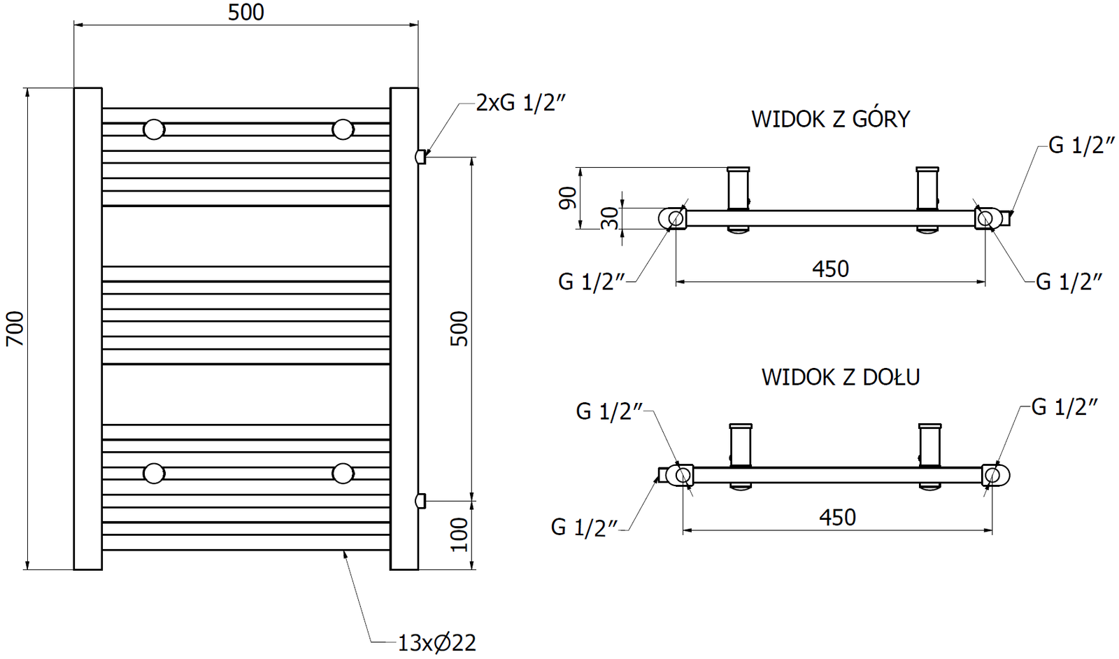- 4xG ½″ iš viršaus ir apačios iš dešinės arba kairės pusės