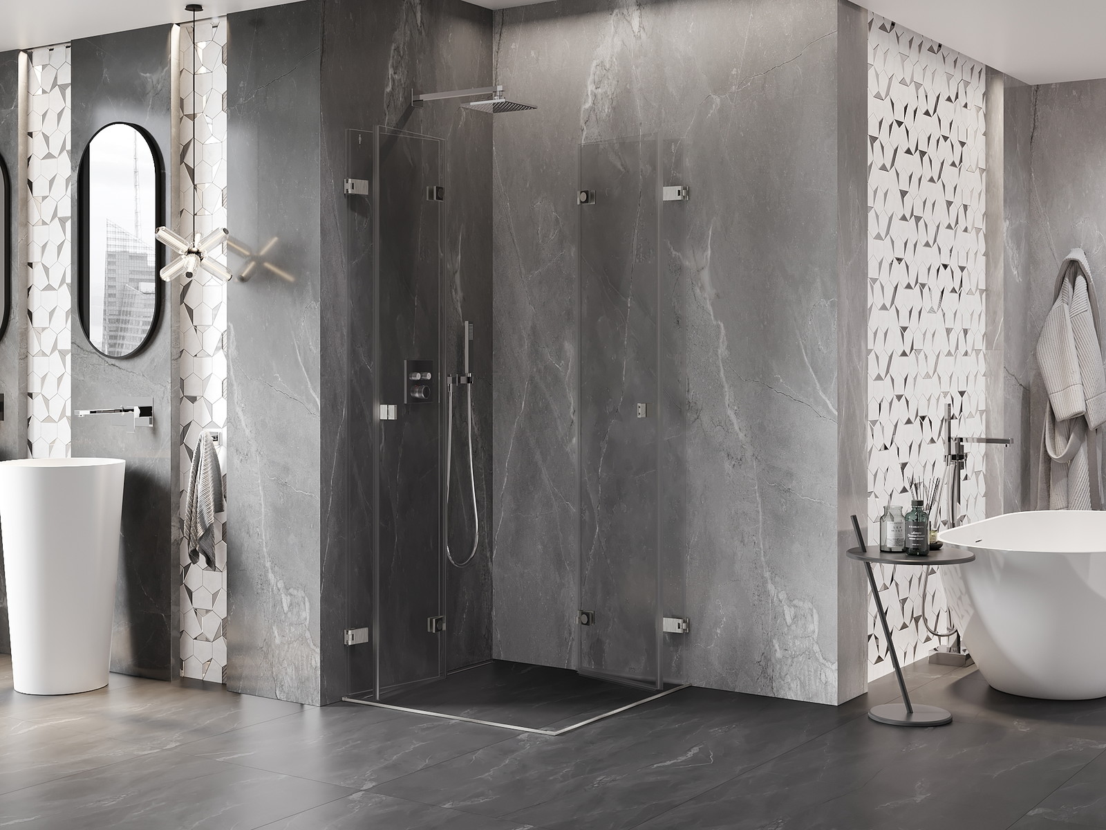 Galimybė sulenkti duris, tiek į išorę, tiek į vidų, leidžia gauti daugiau erdvės nenaudojant dušo. Tai yra idealus sprendimas mažesnėms vonios kambariams, maksimaliai išnaudojantis turimą plotą.