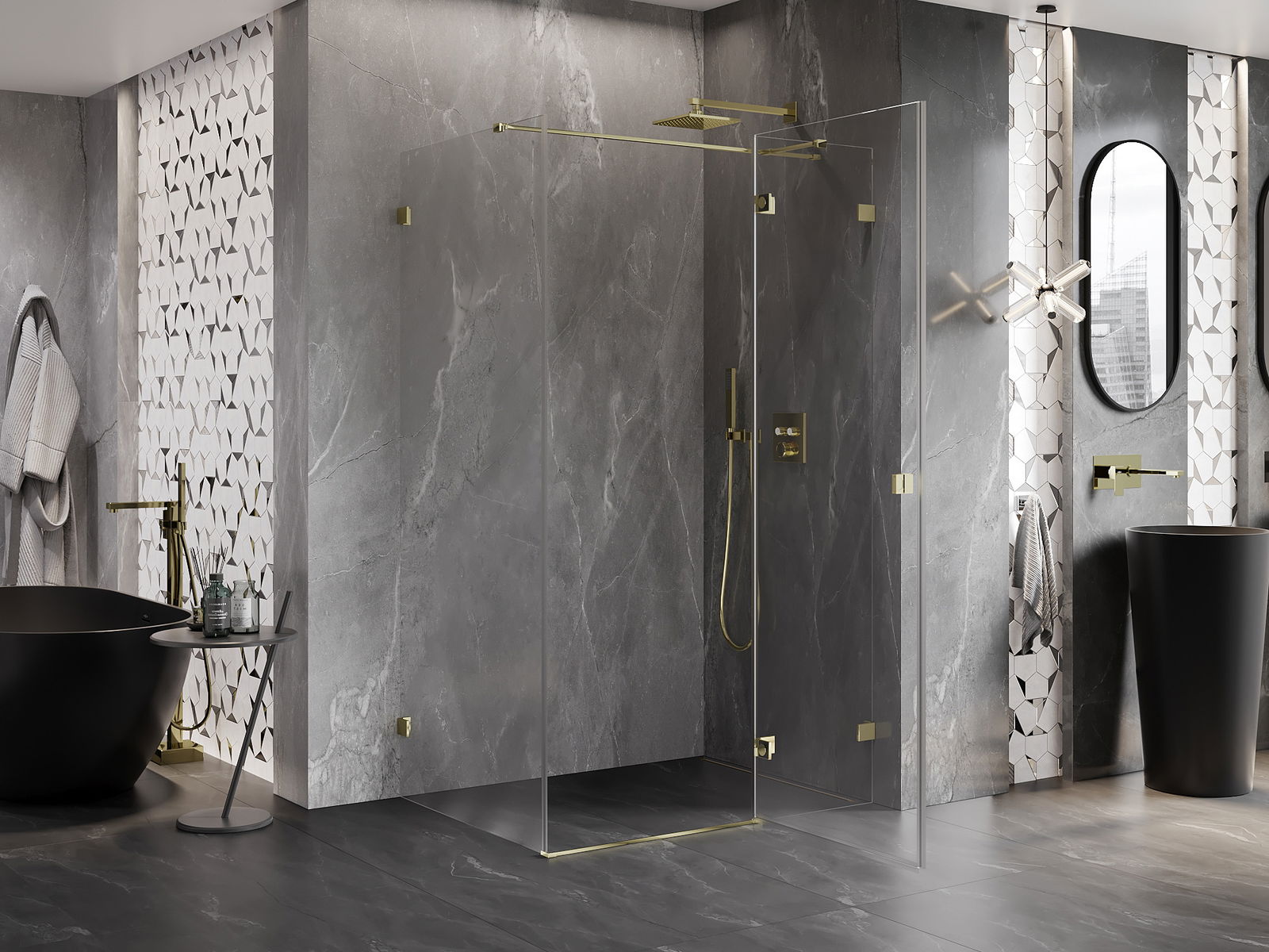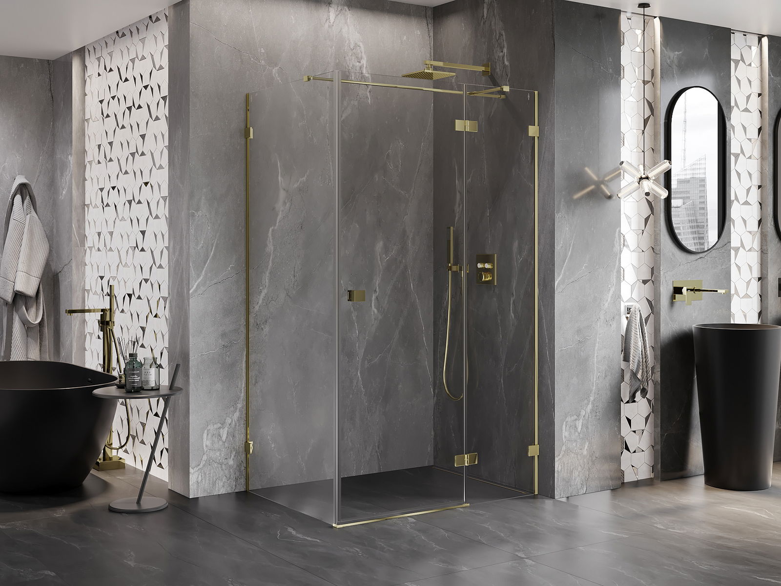 Spaustukai ir vyriai pagaminti iš labai patvaraus žalvario, papildomai sukuriantys lygią stiklo plokštumą. Tai puikus pasirinkimas, jungiantis eleganciją, patvarumą ir šiuolaikinį dizainą. Tokie sprendimai prideda dušo estetikai ir tuo pačiu palengvina švaros palaikymą.