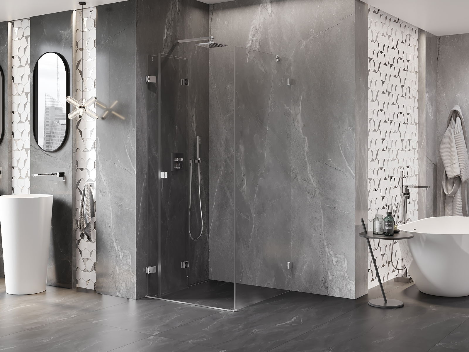 Galimybė sulenkti duris, tiek į išorę, tiek į vidų, leidžia gauti daugiau erdvės nenaudojant dušo. Tai yra idealus sprendimas mažesnėms vonios kambariams, maksimaliai išnaudojantis turimą plotą.