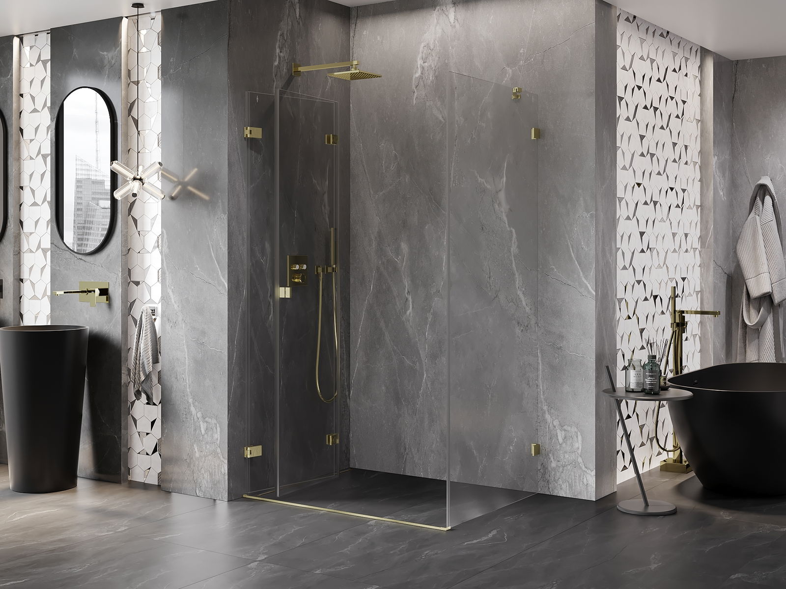 Spaustukai ir vyriai pagaminti iš labai patvaraus žalvario, papildomai sukuriantys lygią stiklo plokštumą. Tai puikus pasirinkimas, jungiantis eleganciją, patvarumą ir šiuolaikinį dizainą. Tokie sprendimai prideda dušo estetikai ir tuo pačiu palengvina švaros palaikymą.