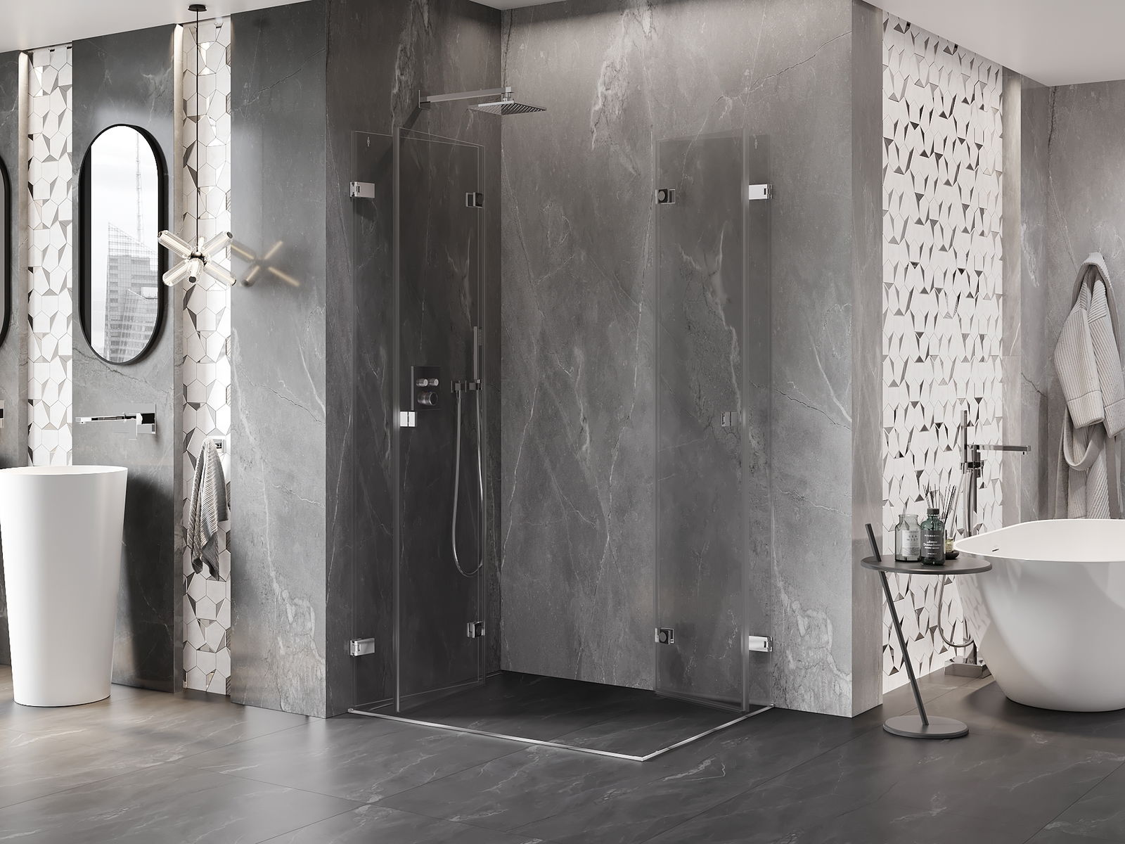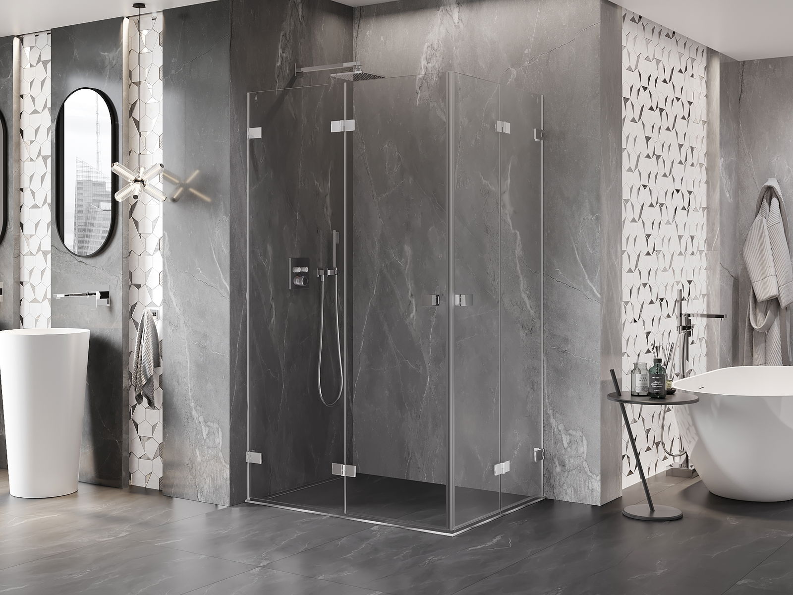 Galimybė sulenkti duris, tiek į išorę, tiek į vidų, leidžia gauti daugiau erdvės nenaudojant dušo. Tai yra idealus sprendimas mažesnėms vonios kambariams, maksimaliai išnaudojantis turimą plotą.
