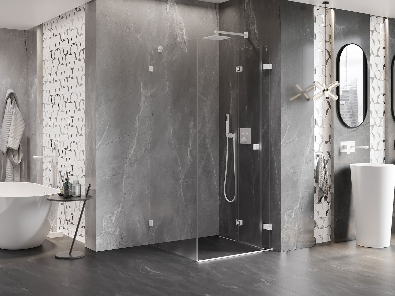 Galimybė sulenkti duris, tiek į išorę, tiek į vidų, leidžia gauti daugiau erdvės nenaudojant dušo. Tai yra idealus sprendimas mažesnėms vonios kambariams, maksimaliai išnaudojantis turimą plotą.
