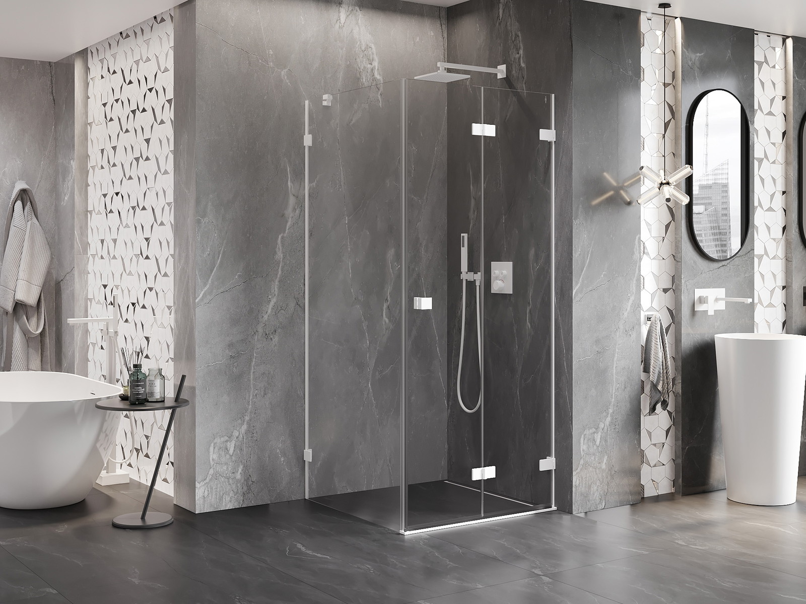 Galimybė sulenkti duris, tiek į išorę, tiek į vidų, leidžia gauti daugiau erdvės nenaudojant dušo. Tai yra idealus sprendimas mažesnėms vonios kambariams, maksimaliai išnaudojantis turimą plotą.